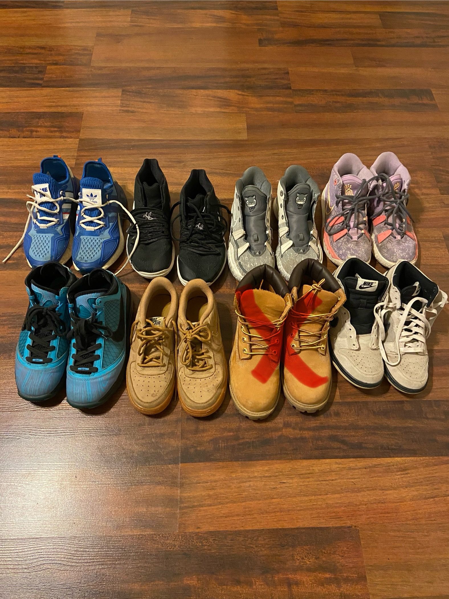 I am not selling these for $2 each .. DM your Offers Lebron VII All-Star ‘Chlorine Blue’ size 6Y Nike Air Force 1 ‘Wheat’ size 4.5Y Nike Dunk ‘Light Bone’ 4.5Y Adidas Ninja X ZX 2K Boost J ‘Time In Blue’ size 5.5Y Nike Kyrie V ‘Black Magic’ size 6.5Y (court worn) Nike Kyrie VII SE ‘Chip’ size 5.5Y (worn twice) Nike Kyrie VII ‘Daughters’ size 6Y All shoes are in very good condition basketball shoes have been mostly court worn except the ‘Daughters’. Looking for offers on everything. Will bundle. All laces will be provided upon sale.