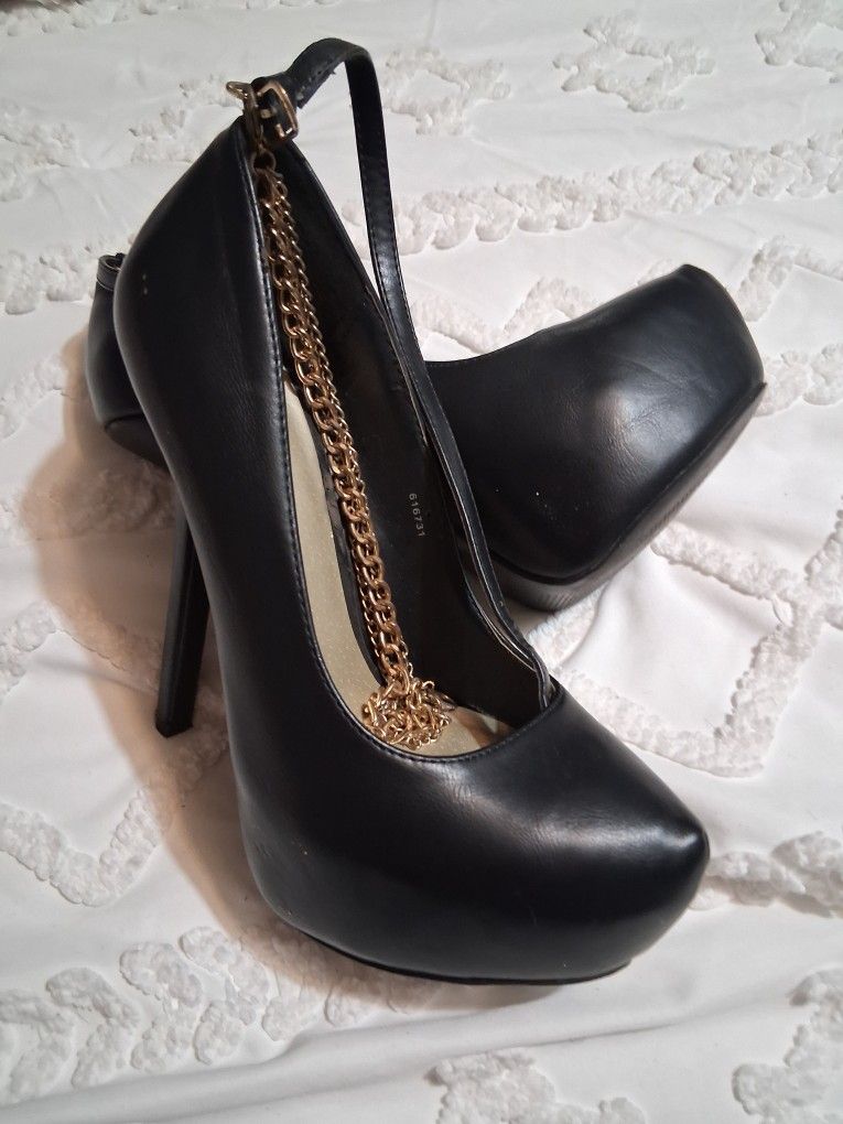 Condition: Good – lightly used Black platform heels featuring elegant gold chain detailing. Perfect for nights out, special events, or photoshoots. Comfortable platform design with a high stiletto heel. Clean and well cared for. Very confortable You can dance all the night long with them without any problem on your feet (Available in red, nude and black colors)