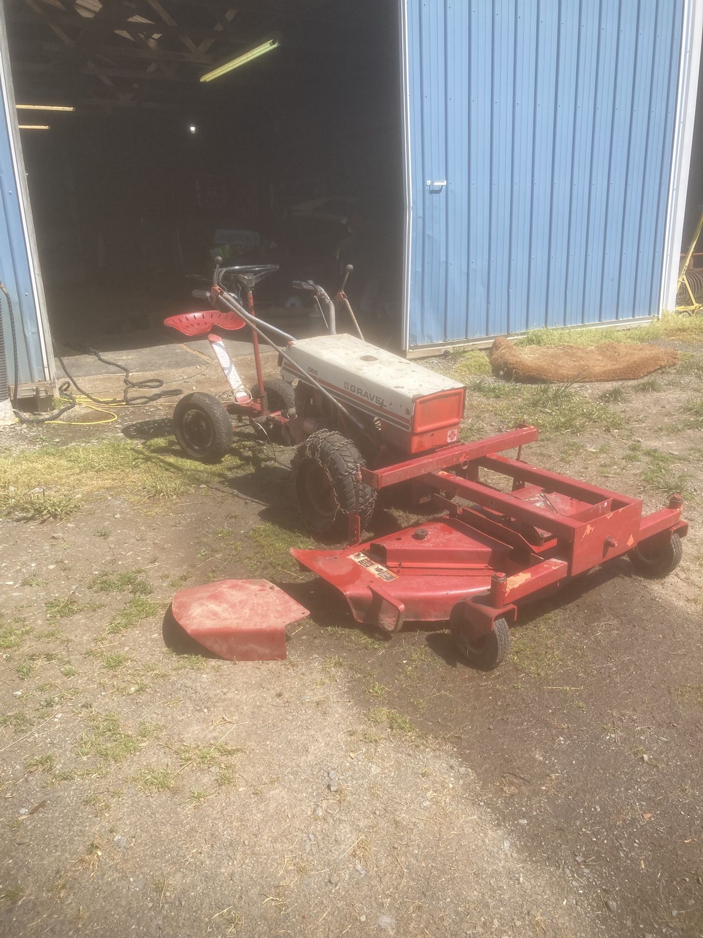 Gravely two wheel tractor with a sulky and two attachments. One finish mower and one brush hog.