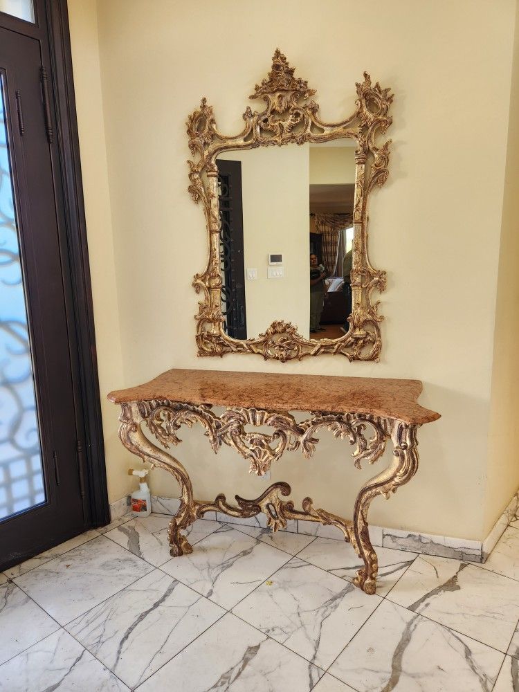 1950's Italian Console table with marble top and mirror Beautiful carved wood in excellent condition