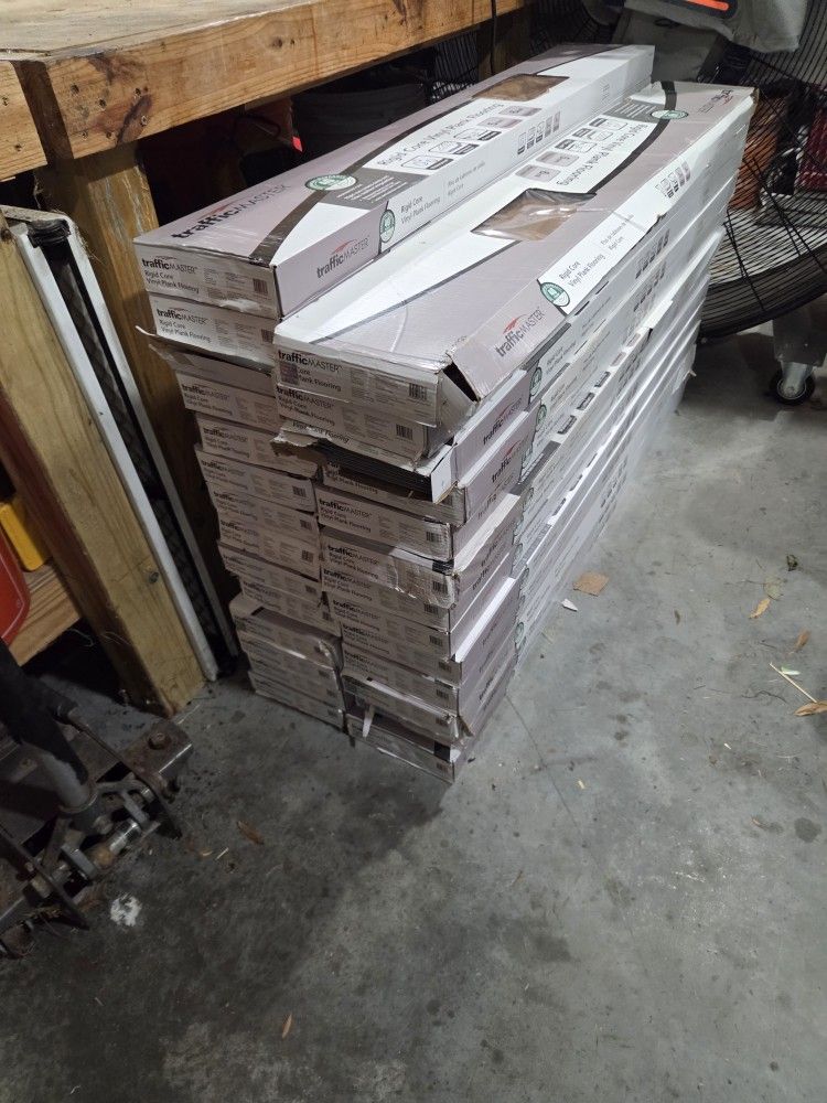 There are 27 brand new boxes Brand new never used. 23.77 sq ft. Per box with a total Sqft of about 642sqft These go for $50 a box retail. Selling all together. Ardenmore Oak 6 MIL x 7 in. W x 48 in. L Waterproof Click Lock Vinyl Plank Flooring
