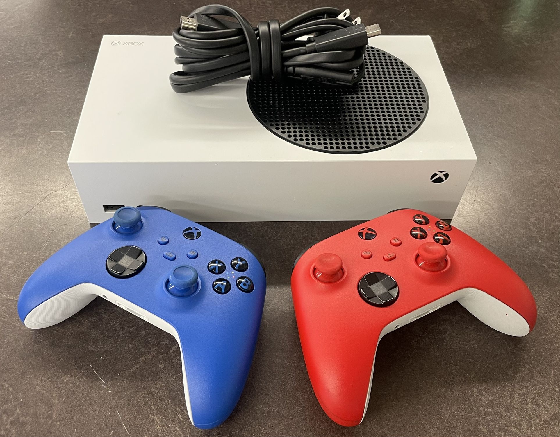 Up for sale is a Microsoft Xbox Series S (Model 1883) digital gaming console with 512GB of storage. This compact, all-digital system is perfect for modern gaming without the need for physical discs. The console has been tested and works as intended. It comes with two fully functional wireless controllers—one red and one blue—both showing cosmetic wear from normal use. Condition: Pre-owned, good working condition. The console and both controllers have visible signs of use including scratches and scuffs. Fully tested and functions properly. Included: Xbox Series S 512GB Digital Console (Model 1883) 2 Wireless Controllers (Red & Blue) Power Cord HDMI Cable 42563