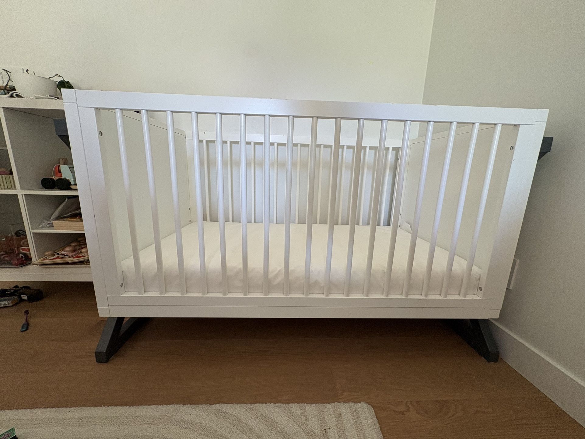 Selling our used Storkcraft Equinox crib in good used condition. Converts from crib to toddler bed (toddler rails included). Comes with a high-quality, organic Naturepedic crib mattress. Modern, stylish design- white and gray Also comes with 4 fitted sheets- one has never been opened. Sturdy and safe Toddler conversion rails included Naturepedic mattress is waterproof, breathable, and in very good condition Everything has been well cared for and comes from a clean, smoke-free, pet-friendly home. It is fully assembled and would need to be picked up in a vehicle that can fit it.