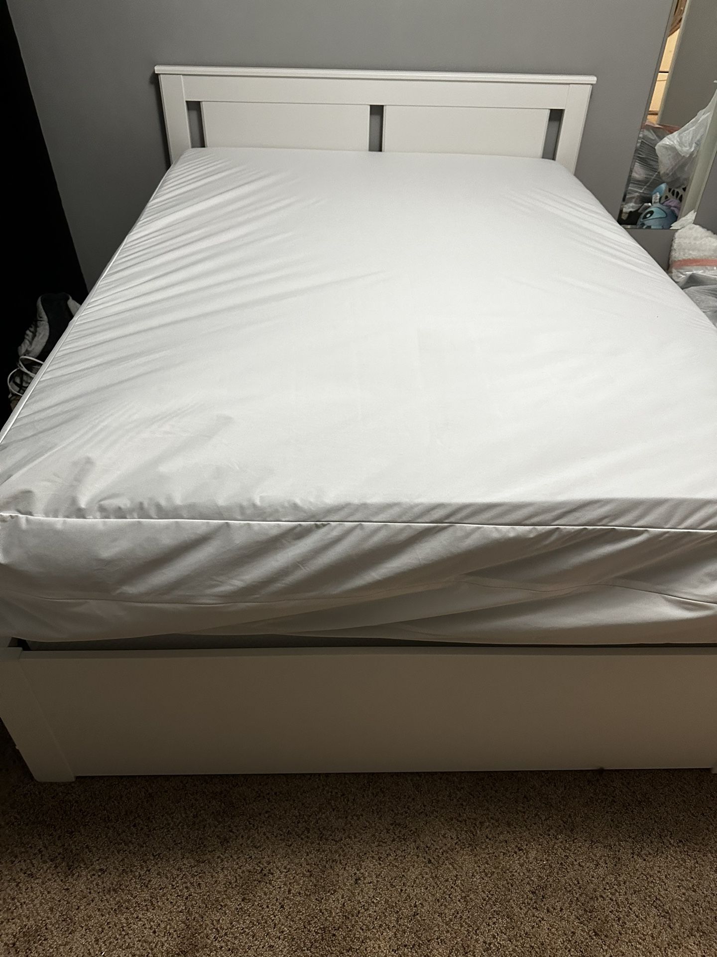 I have a white Ikea full bed with mattress and box spring. There are two drawers underneath for storage. Mattress has been in a protector since we bought it. Asking 350$
