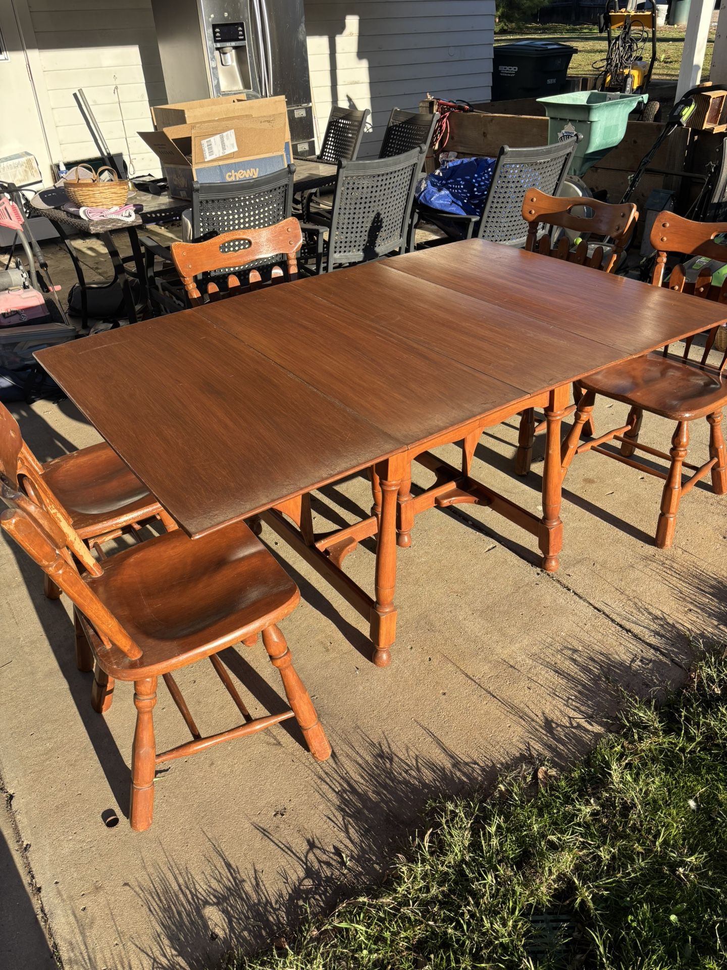 Available if the post is up. Thanks. Rare drop leaf table by Sprague and Carleton. Made of solid hard rock maple. Comes with 5 matching chairs. Both ends of the table fold up for more space for dining. Aside from a few minor blemishes on the chairs and table the set is in tremendous shape for its age. The table is very sturdy as are the chairs. 63” L with extensions and 27” L without 42” W and 30” T. Thanks for looking.