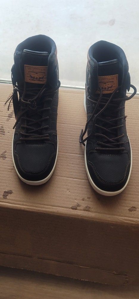 Levi high tops Black w/brown Mens size 8.5 No rips, no tears Tread excellent condition Sole excellent condition Tag still on Worn once for a few hrs. No longer fits