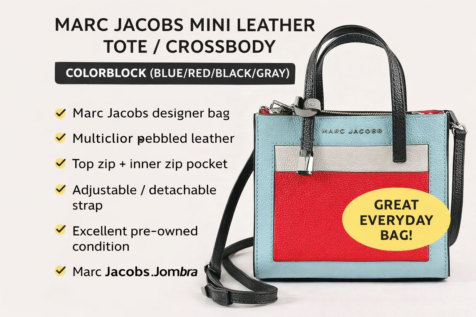 Super cute Marc Jacobs mini tote with a bold colorblock design! Can be carried by the top handles or worn as a crossbody with the adjustable detachable strap. Perfect everyday designer bag — small but holds the essentials. DETAILS • Brand: Marc Jacobs • Style: Mini tote / crossbody • Color: Multicolor (light blue, red, black, gray, white) • Material: Pebbled leather • Closure: Top zip • Hardware: Silver-tone • Strap: Adjustable + detachable crossbody strap • Interior: Fabric lining + zip compartment • Handles: Dual top handles CONDITION Pre-owned, excellent condition. See pictures and feel free to ask any questions. SHIPPING Ships fast + securely. Bundle to save on shipping!