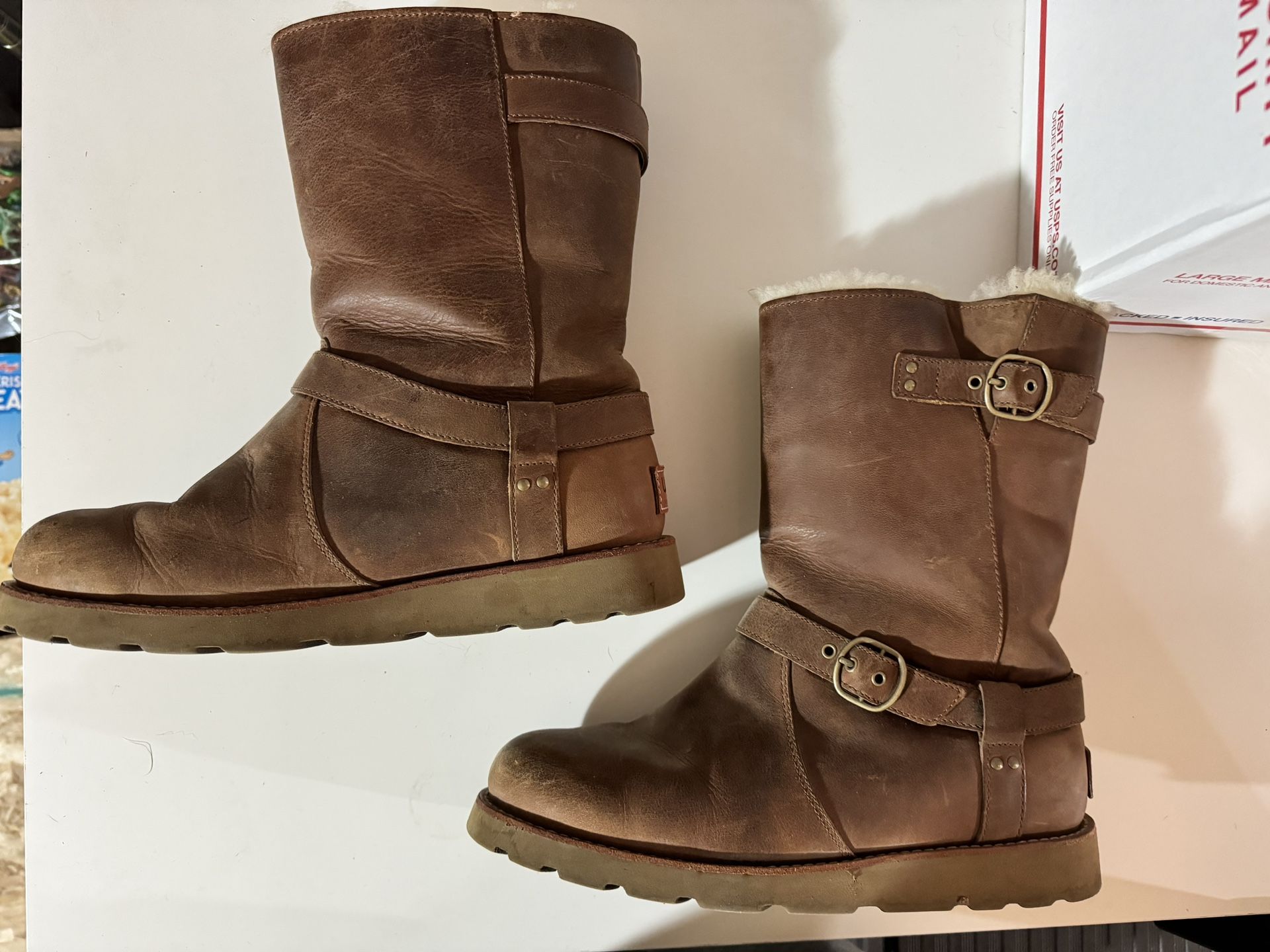 Size 8. Lightly worn, but you can buy a new sole from Uggs if you want it to feel like new. Leather exterior great for the wa weather.