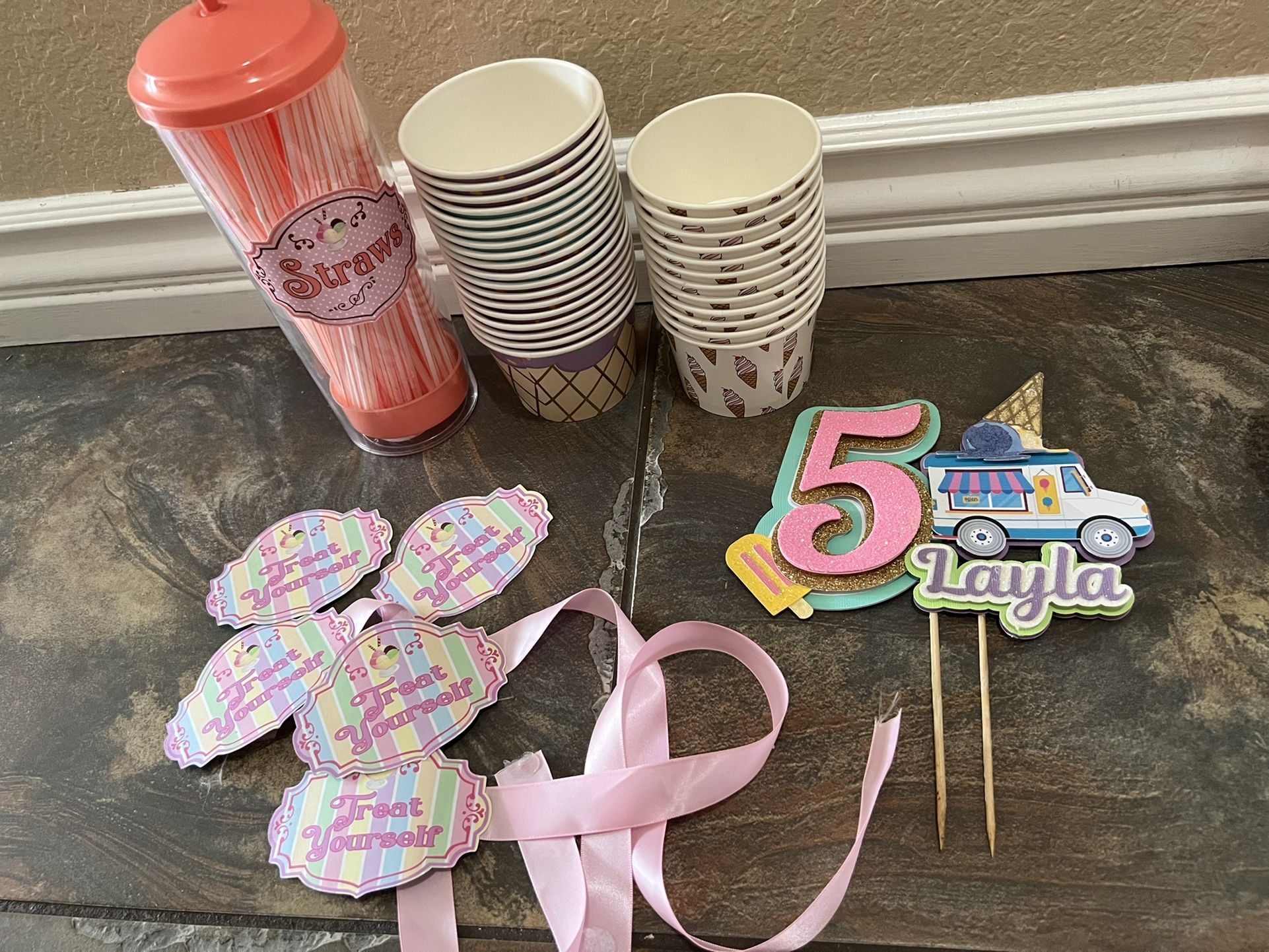 Ice cream theme small random stuff Straw plastic container dispenser Ice cream bowls Candy jar labels Cake topper. Needs new sticks. Name can be removed. All for $6 Pick up only in San Jacinto by Ramona express No holds unless paid by Zelle