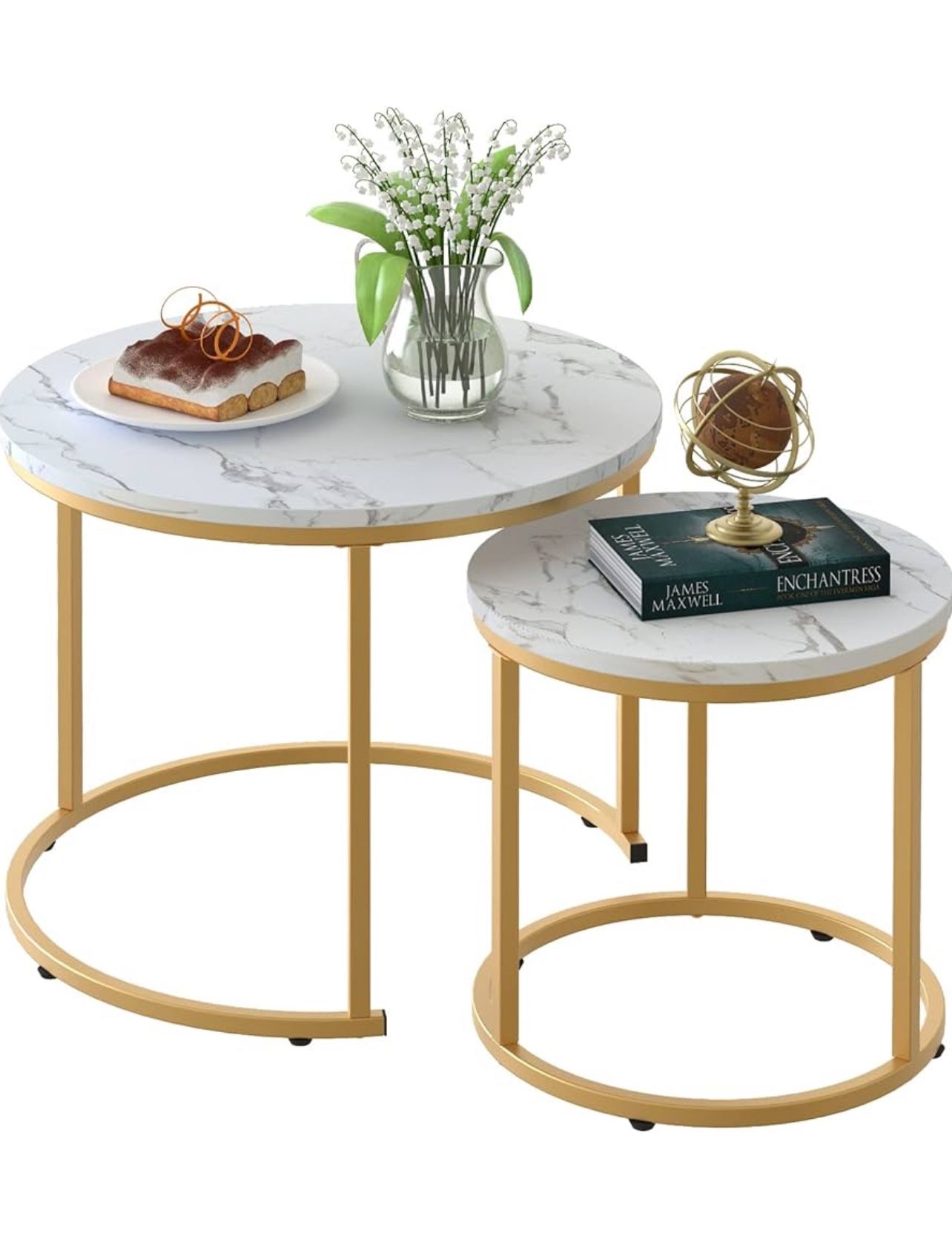 Brand New! Coffee Table Nesting White Set of 2 Side Set Golden Frame Circular Round and Marble Pattern Wooden Tables, Living Room Bedroom Apartment Modern Industrial Simple Nightstand First come first serve!