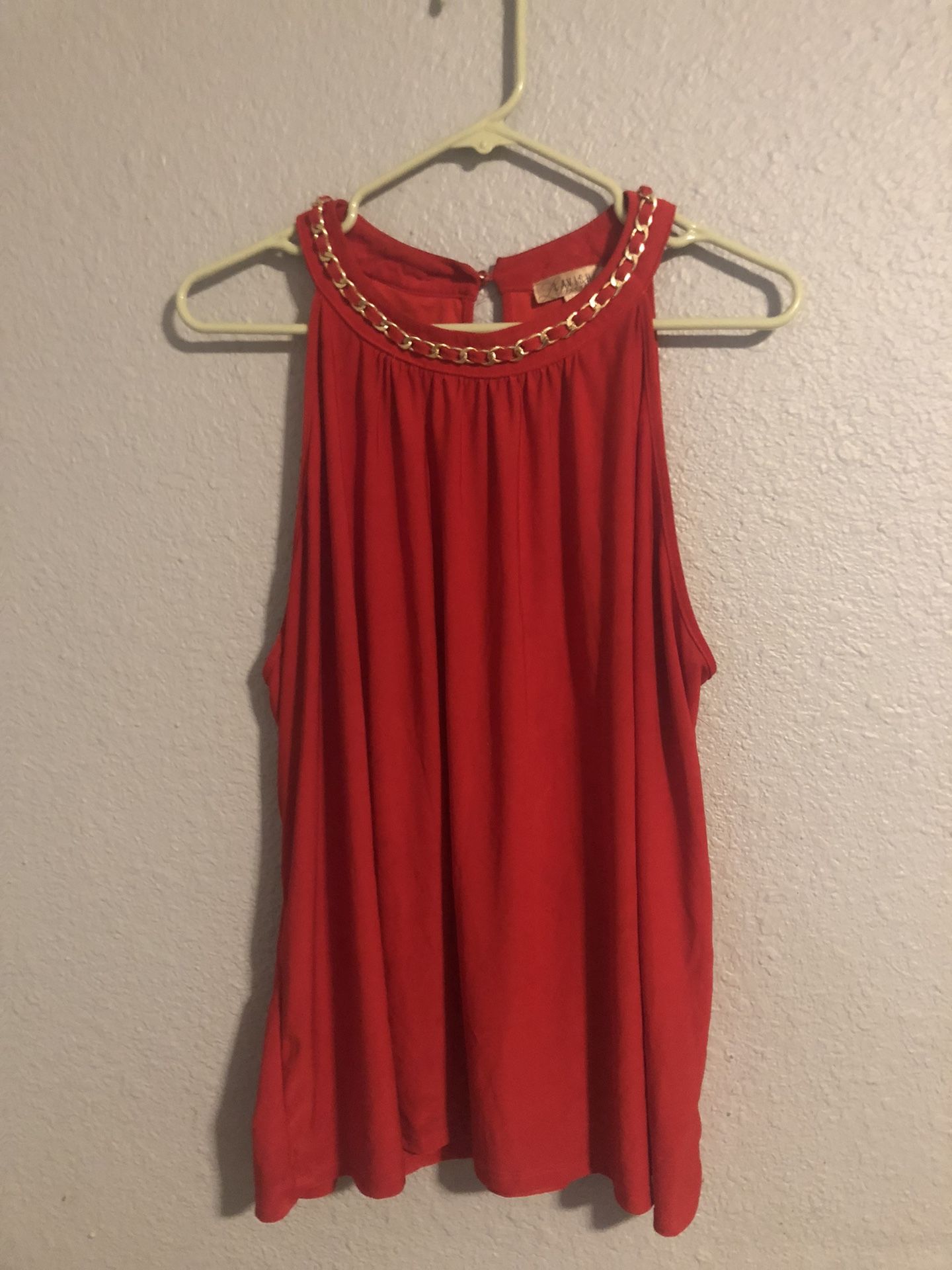Red Tank Top with Gold Chain around neck. Also in my list of items I am selling, there are matching shoes and a matching purse if interested.