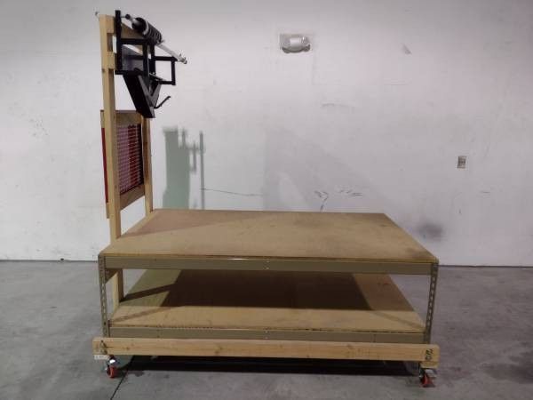 - we custom made it for our warehouse for packaging stations - the frame is a combination of metal frame and 2x4 s - the work surface is a wooden board 1/2" thick -the workbench and shelf have braces for extra strength -we put heavy duty casters to make it easy to move them around; even with several hundred pounds of load on them -having the bottom shelf makes it easy for storing supplies or temporary storage -the workstation is big enough for two or three people -easy to assemble; just a few screws and the shelves lock in place -paper crumpler assembly not included -two height is 40"; you can adjust the height easily -have two workstations; willing to take $700 for the set or $375 each We have disassembled the workstations to make it easy to transport them