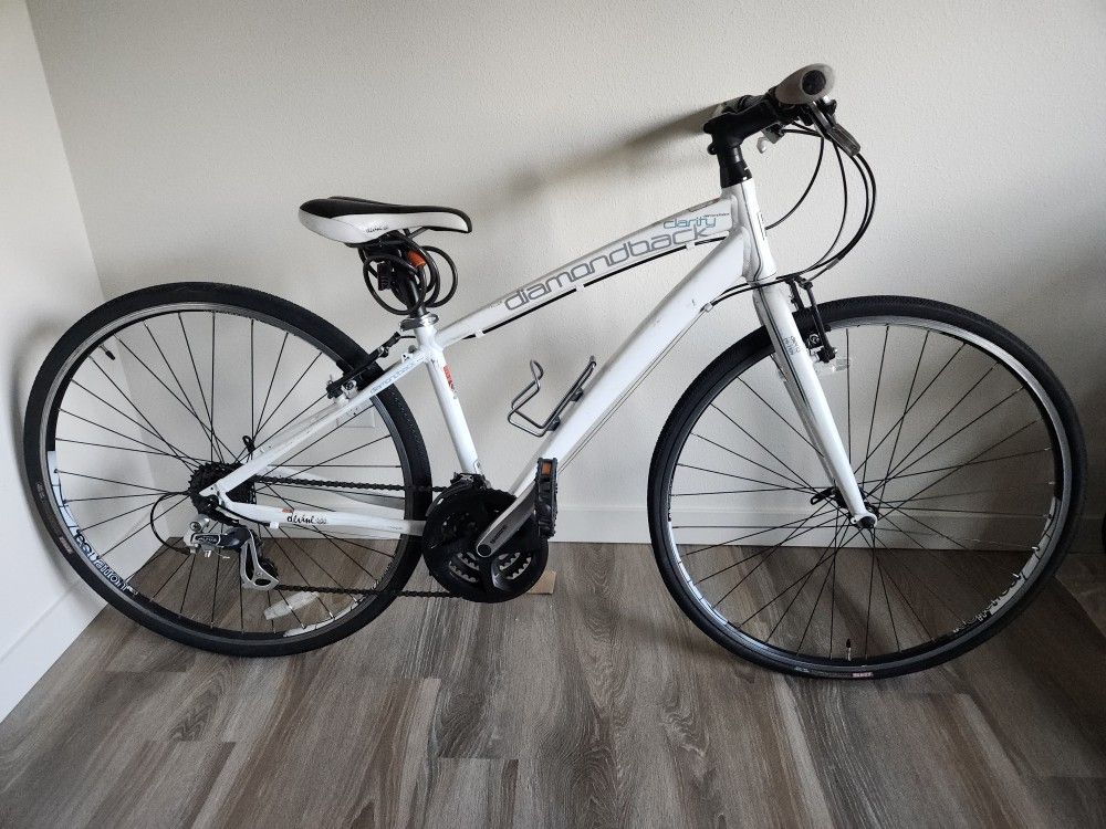 Women's hybrid bike: mountain frame with street tires. Rear tire (not wheel) needs to be replaced. Water bottle holder installed. Ferrous Hi-Ten Steel.