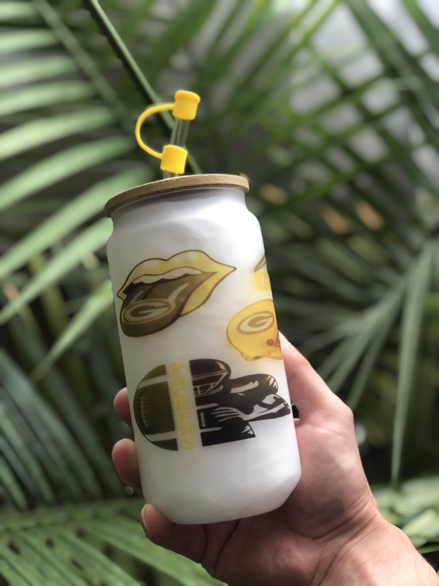Green Bay Packers Frosted Libby Glass With Bamboo Lid And Glass Straw With Topper