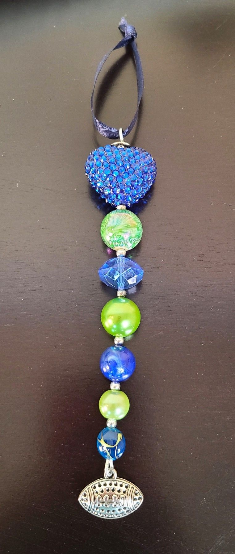 Pretty Seahawks football beaded charm, custom made by local crafter, in new condition Has a sequined heart, faceted and marbled beads and a silver toned football charm all in shades of blue or green 6" long, 9" total including ribbon I have more Seahawks items, check out my other listings. Can meet or mail this jewelry, Seahawks, Seattle, fan, decor, charm, keychain, decor, bag charm