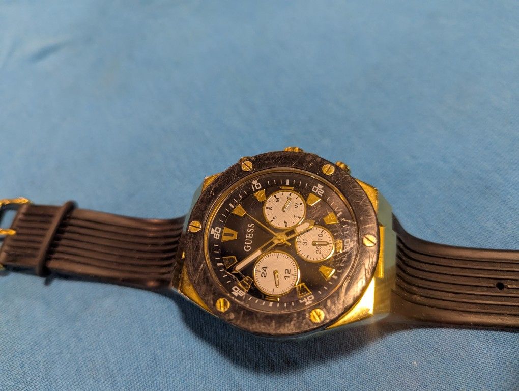 Guess Men's Poseidon Black and Gold Tone multi-function watch The watch has normal wear and tear. Some scratches on the back plate and face from normal use. Retails for around $180-$190 . Make an offer