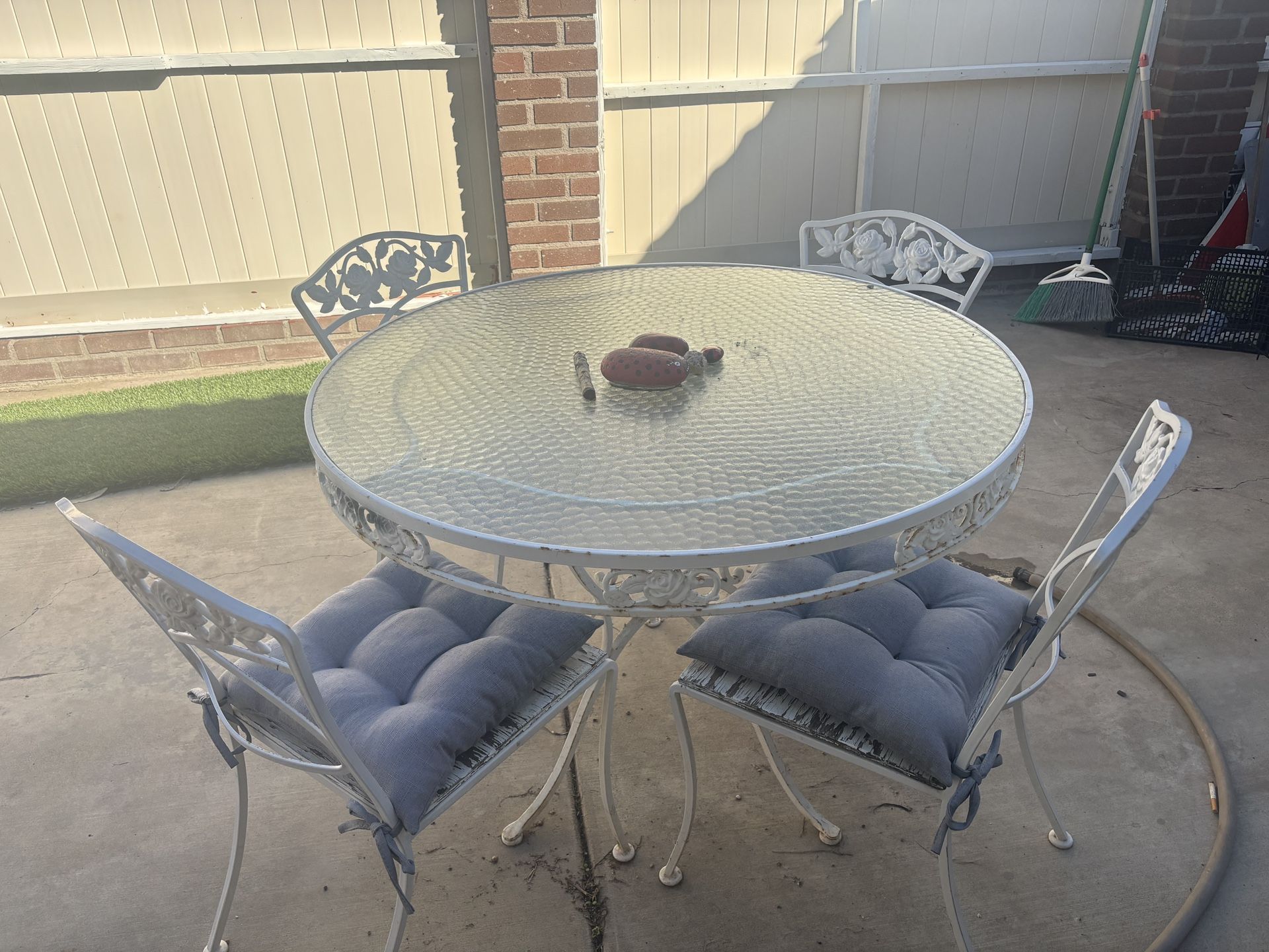 Glass topped Iron table and 4 chairs. Chairs need sanding.