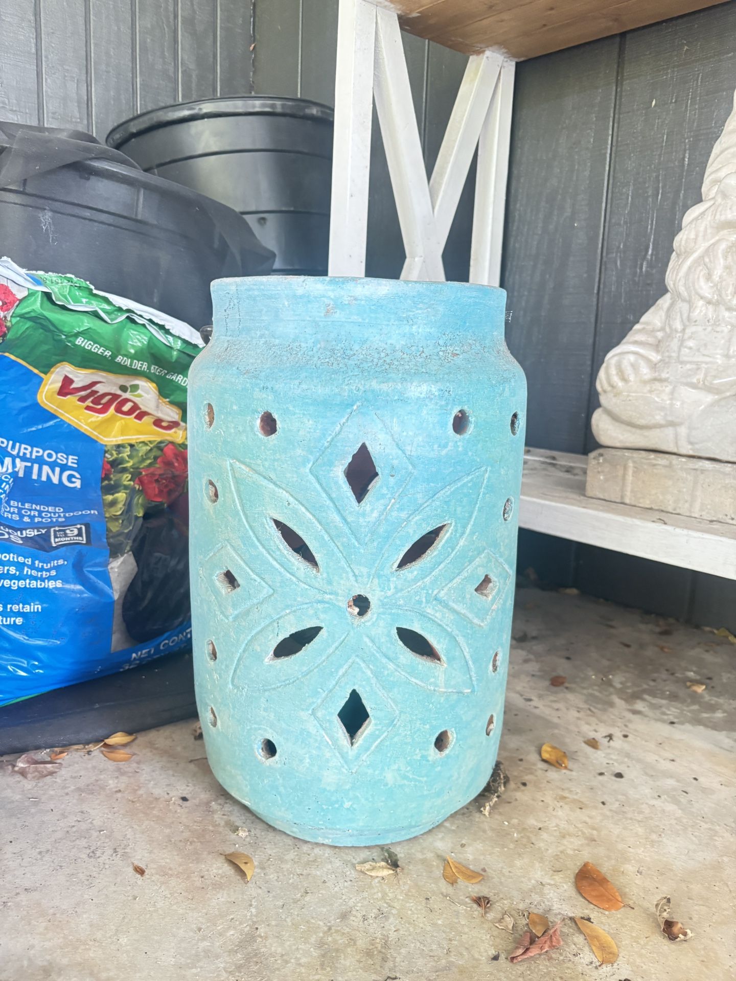 Teal and perfect with a candle in it. I am selling it with unused citronella candle. Perfect for pool or patio. Excellent condition!