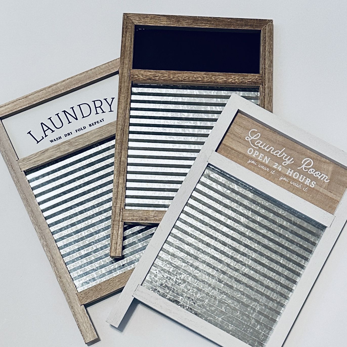 Laundry wash board home decor. Materials in wood, metal and chalk. Styles of wording laundry wash dry fold repeat, chalkboard, laundry room open 24 hours you wear it you wash it. Colors white stain, light stain and dark stain. Dimensions 7 1/4” width x 12” height. **Listing price is for one single item**