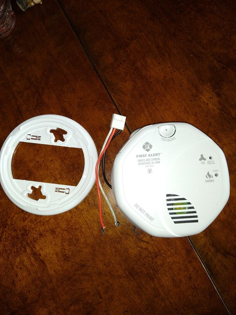 Set of 4 smoke and carbon monoxide detector used less than a year,. Switch out for detectors that go with my alarm system. Come with mount brackets and connectors.