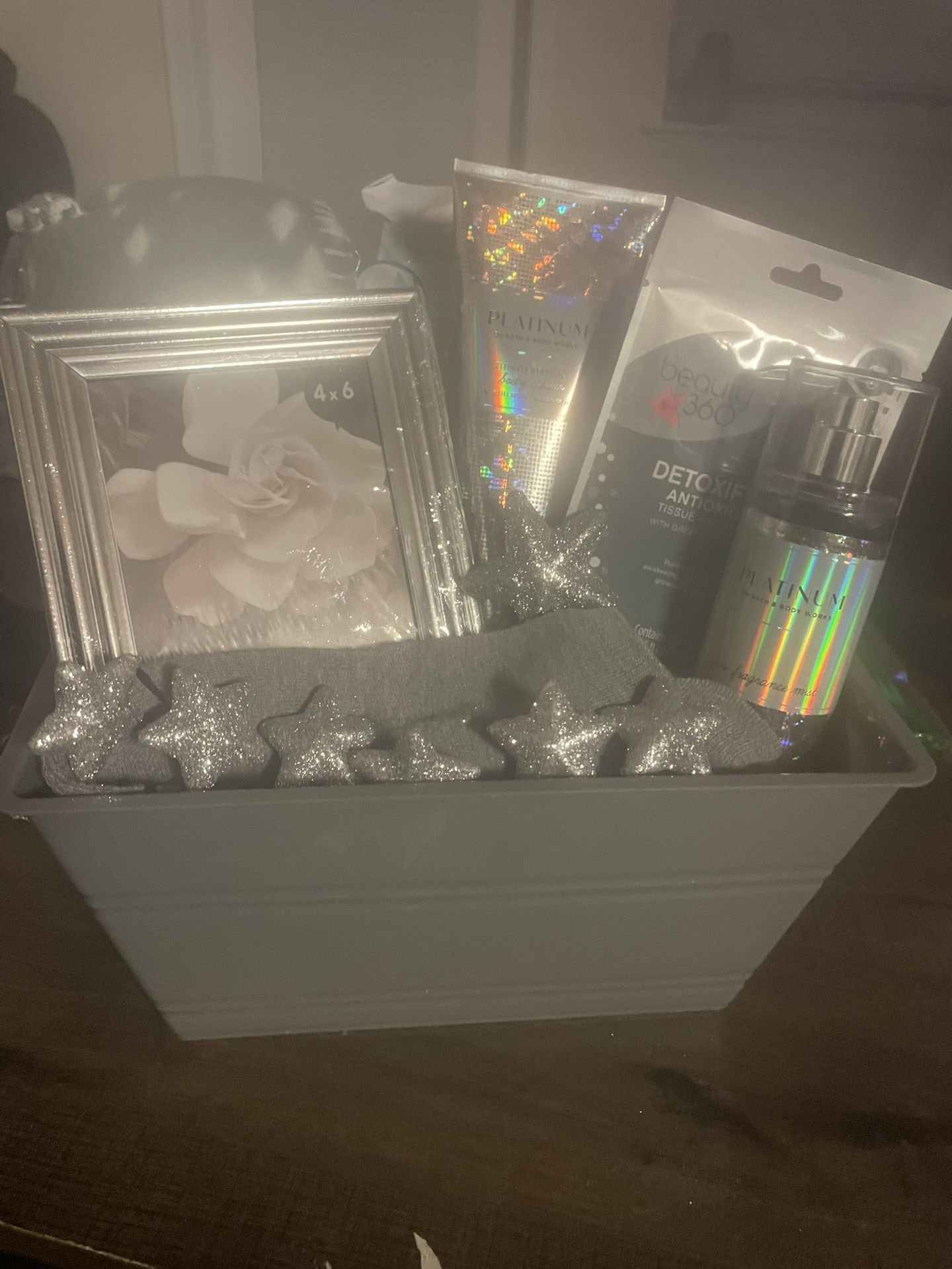 Bath and body works platinum body cream Bath and body works platinum body mist Gray throw blanket Olay body wash 360 spa mask Venus disposable razors 5 x 8 picture frame Sleep mask Steve Madden socks Decorative stars