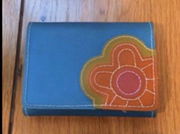 Vinyl blue wallet with card slot and ID slot 1 zipper compartment and 2 pocket compartments 4"w x 3"h