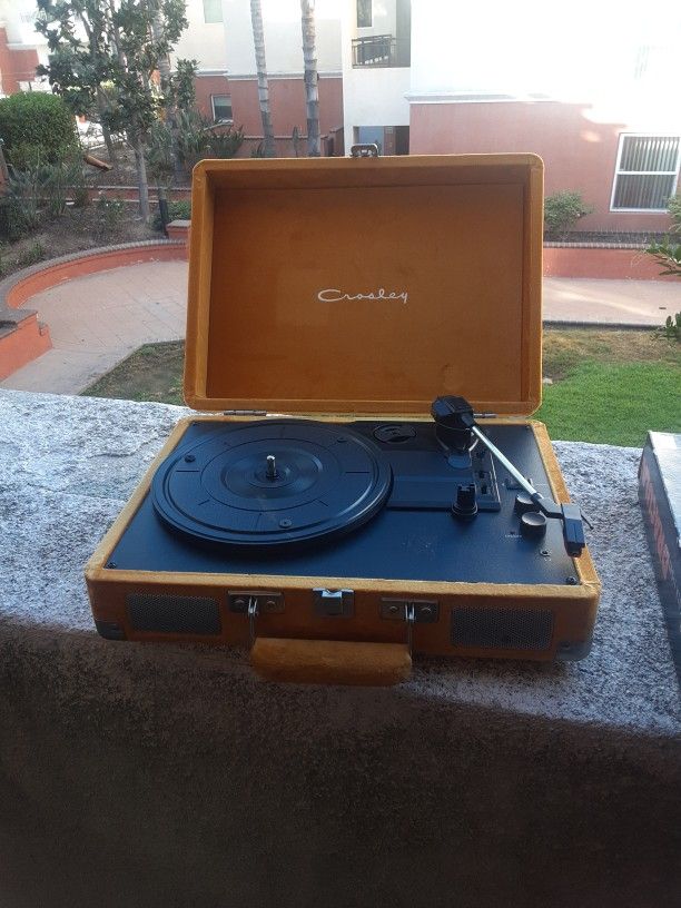 Mini 3 speed Crosley record player, in a suede covering and chrome corner briefcase. Really good condition 20 bucks OBO