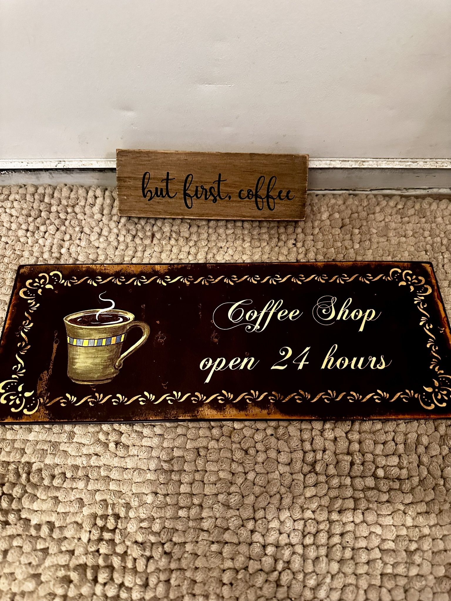 The coffee shop hangs , the wooden one sits or hangs. $5.00 for both. Really cute wall decor. Cash only and I’m available to meet somewhere. Thank you