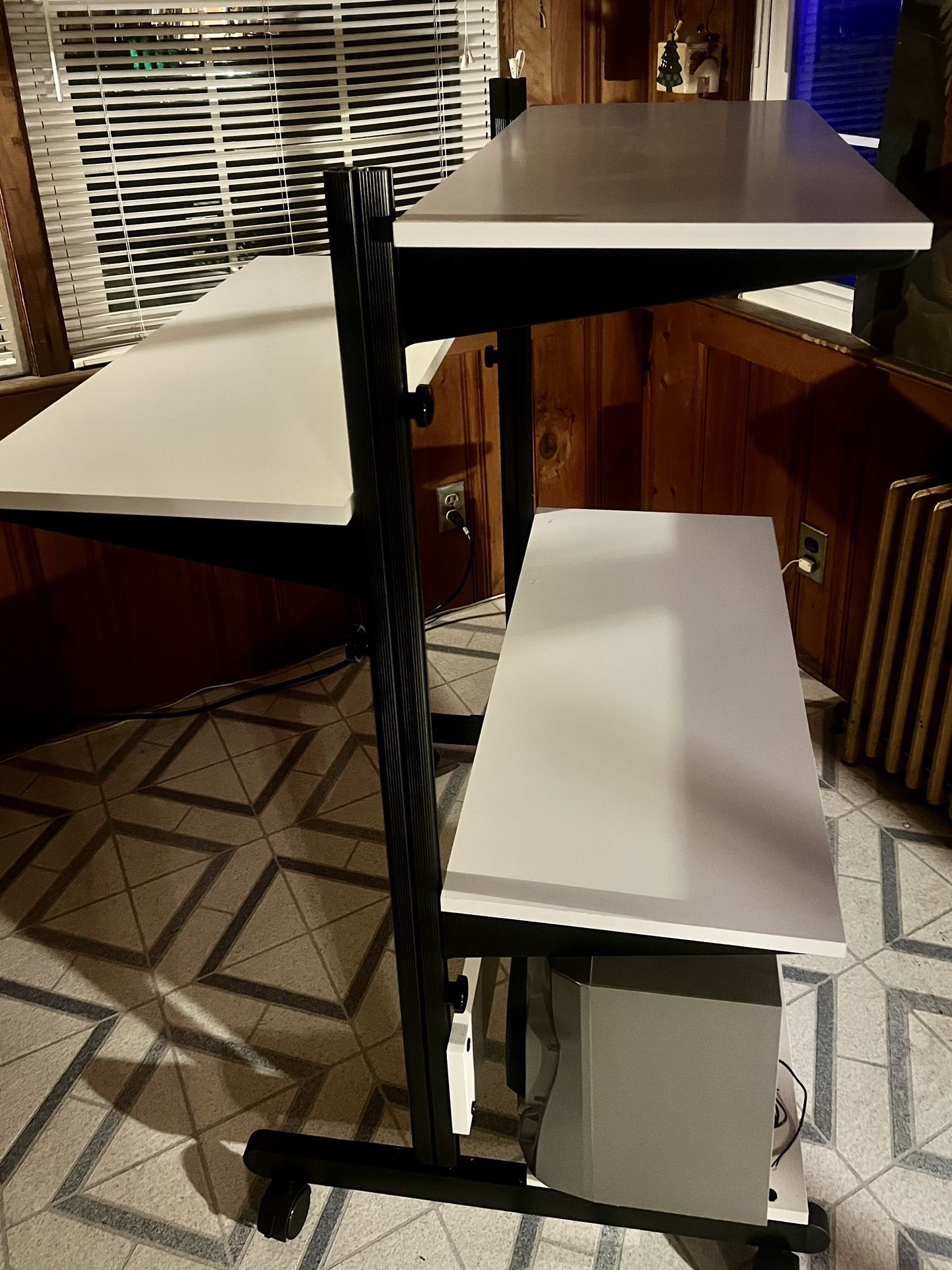 Brand new, just assembled, portable upright desk with three adjustable shelves and one stationary shelf on the bottom. Measurements are 45 inches high 36 inches wide, and a total of 33 inches deep, 15 inch depth on each shelf.