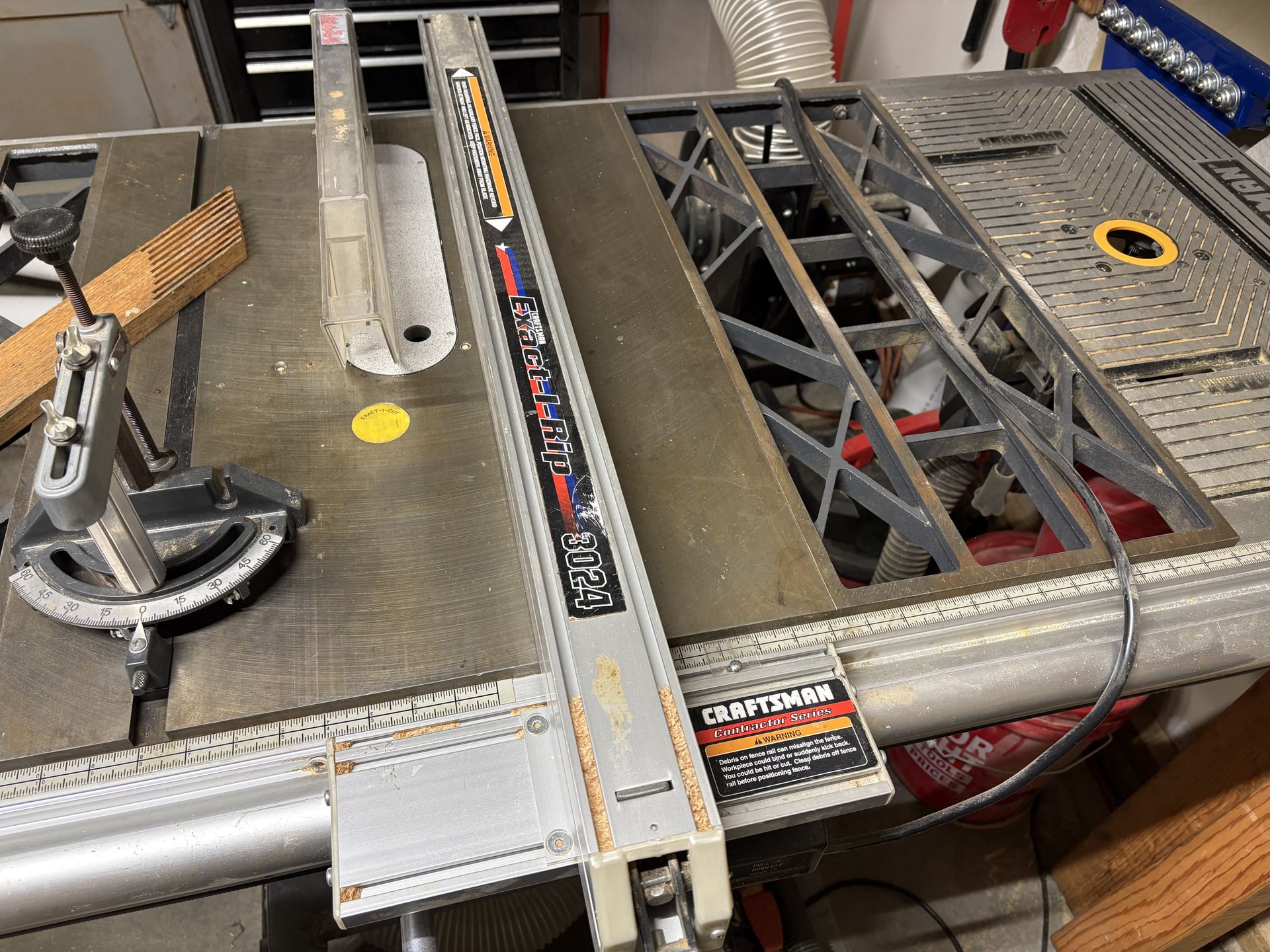 Craftsman 10” contractor series 113 table saw. Has a 1.5 HP motor and solid cast iron extensions with integrated craftsman router table and mounted large router. Movable rolling base and exact-I-rip fence. Comes with splitter and 0-clearance insert. Dust collection plastic housing intact. Miter gauge with it. Moving and can’t take with.