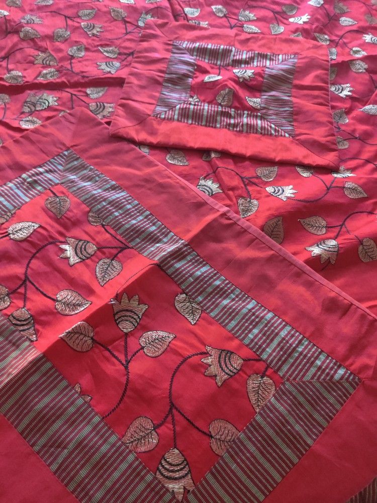 Thai silk bedspread 106x85 in, two pillow cases 15x15in, and 2 shams 17x27in. Golden embroidery, cotton lining.