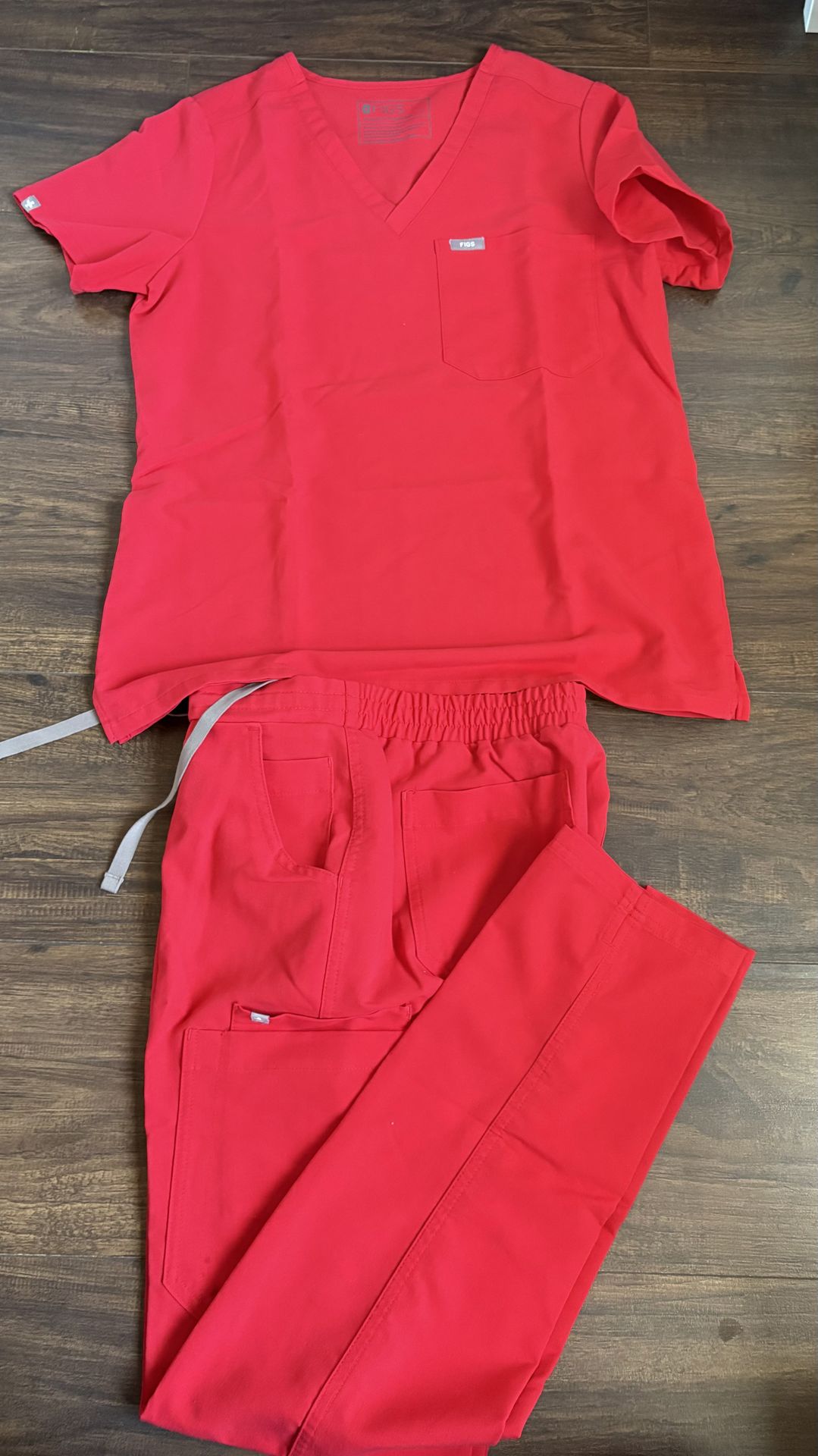 Fig, scrubs, color, red. Shirt size small. Pants size small regular. Straight leg fitting.