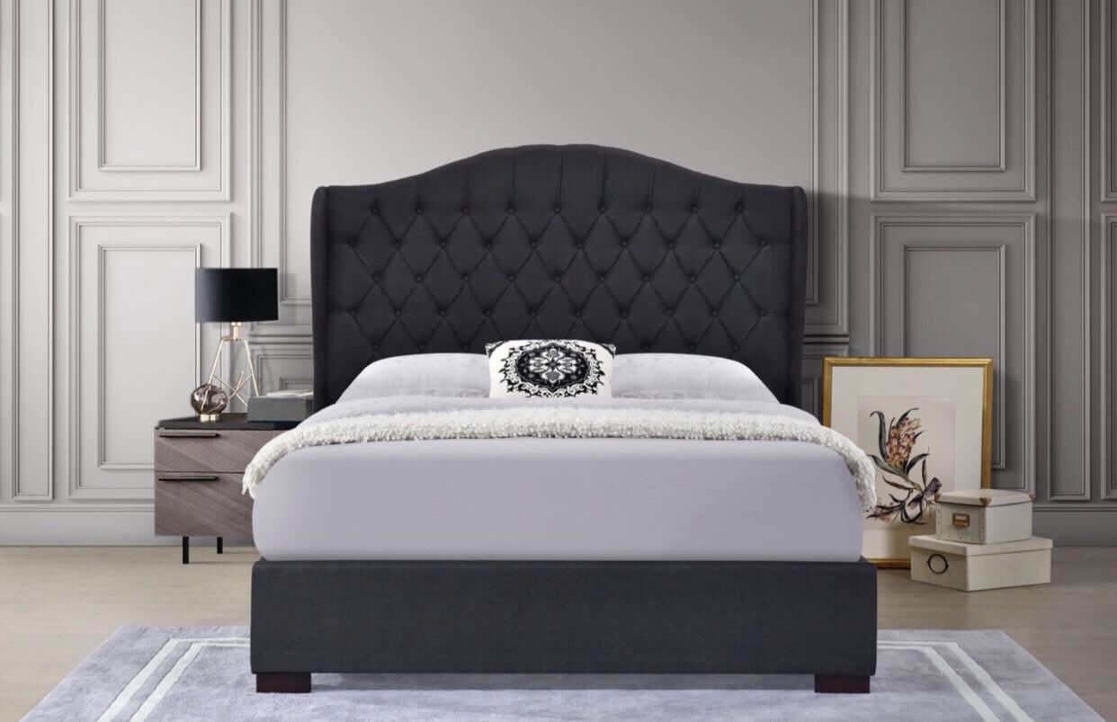 No Display NEW in 3 Boxes, Disassembled Linen Curved Wing Back Tufted Platform Bed with Chunky Legs. (Fully Slated). No Box Spring Required Assemble needed Mattress Is NOT Included Full Size : $389 Queen size: $399 Eastern king or calking size: $449 Cash & Pick Up Delivery available for an additional fees Curbside/garage only