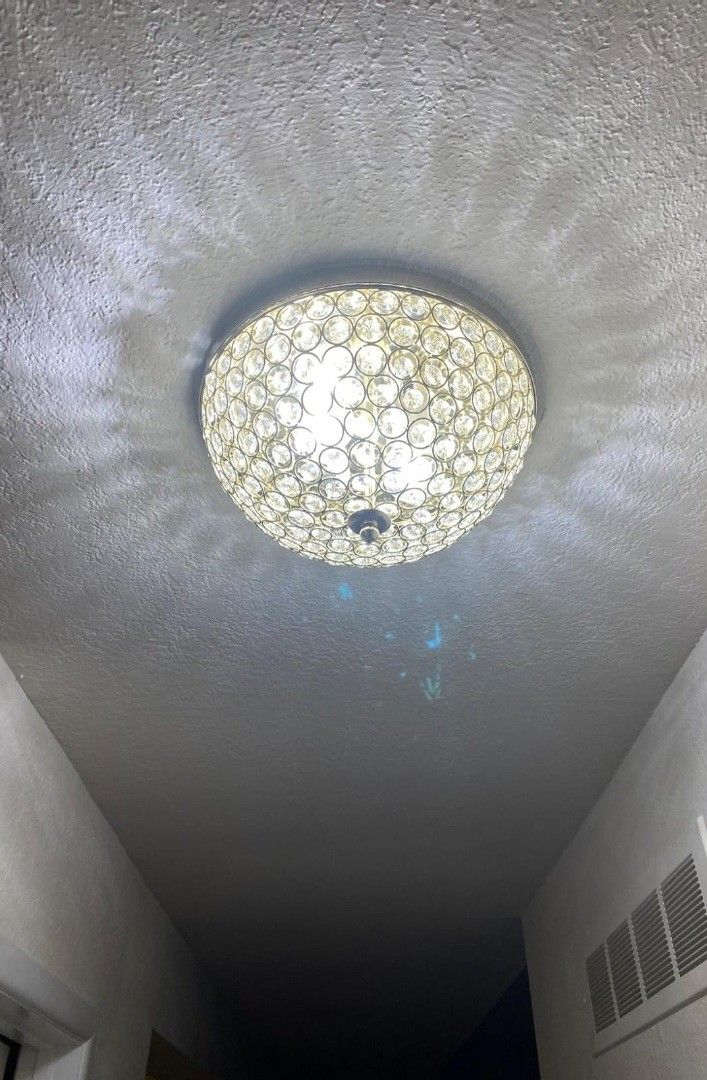 Bejewel your home with this gorgeous two light Elipse tiled crystal and chrome flush mount ceiling light fixture. This fabulously chic design will be the envy of all your friends! Lighting is like jewelry for your home and helps to perfectly enhance any room with elegance and sophistication. Flawless chrome finish. Beautiful 13" diameter , 6.5" high tiled crystal shade. Uses 2 x 60 W medium base type B bulbs (not included) Some assembly required