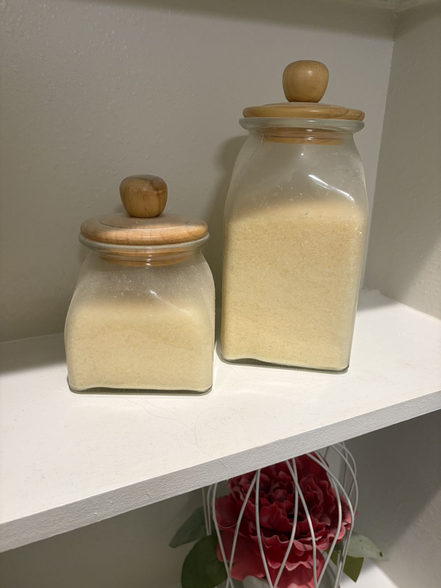 New Set Of Glass And Wood Jars . Great For A Bathroom For Q Tips And Cotton Balls. I Put Epson Salt In It For The Picture To Show You Can Put That In