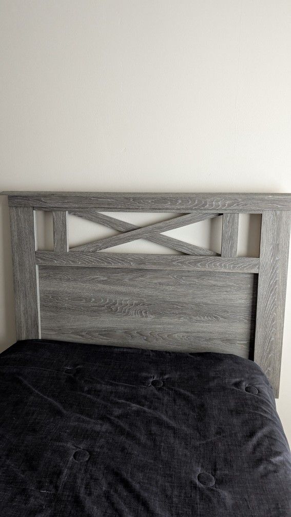 Twin bed XL, gray head board, box spring XL, mattress XL and metal base. OBO