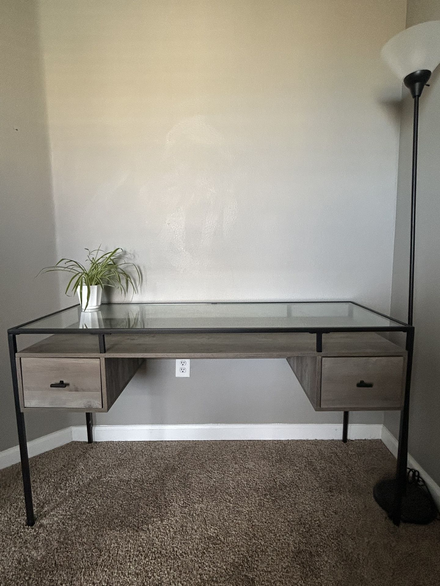 Two layered glass top desk with two drawers. Dimensions: 56in x 22in x 30.5in