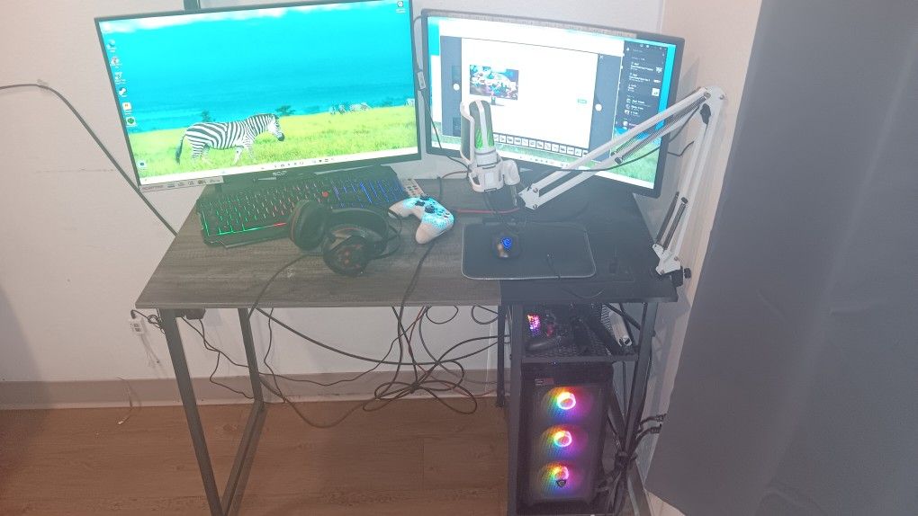 Bundle Includes Gaming PC With Keyboard, Mouse, Headset, Microphone, Webcam, TRIPOD, Desk And Two Monitors Pick up Only