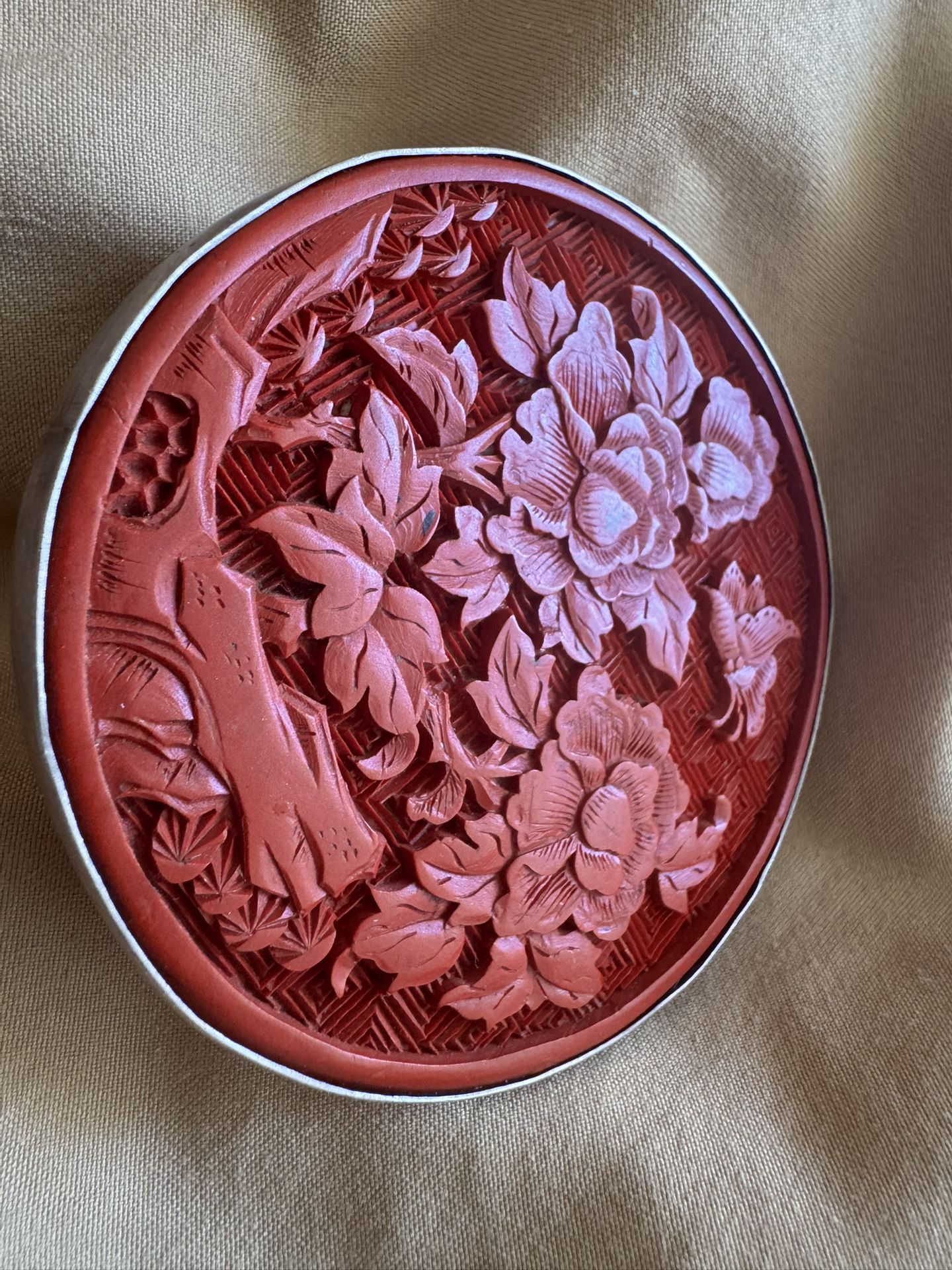 Stunning huge fashion couture ring with faux Cinnabar carving of an Asian motive with flowers and florals design , pure silver adjustable ring, 3 inches diameter ; big fashion statement, couture, very unique Sunny isles beach pick up 33160 $200