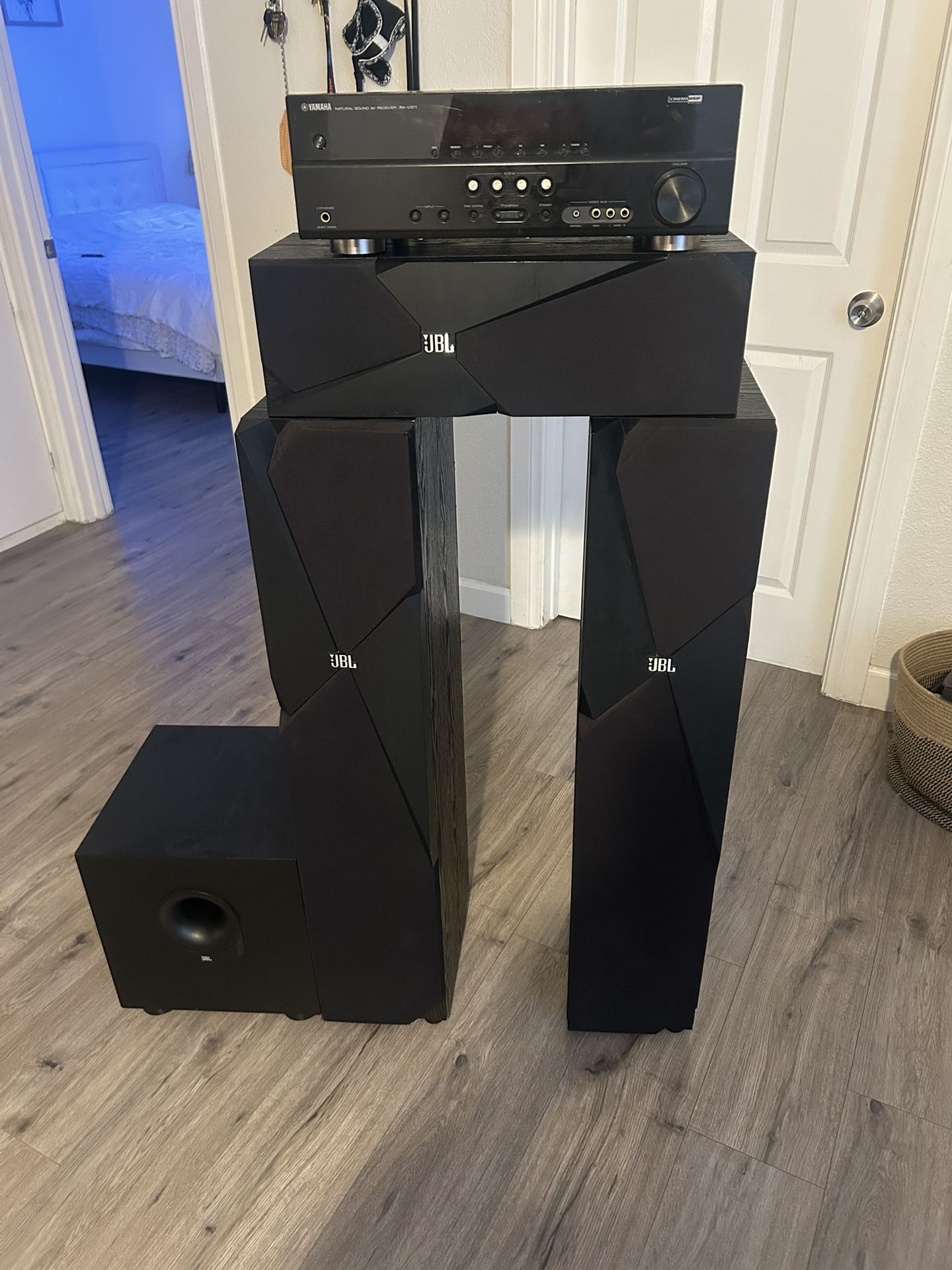 Selling my jbl system with Yamaha receiver everything’s in great condition. The only thing is subwoofer speaker was blown but as you can see in the picture was replaced with the different speaker works great now…asking 250 obo this system gets loud and hits hard