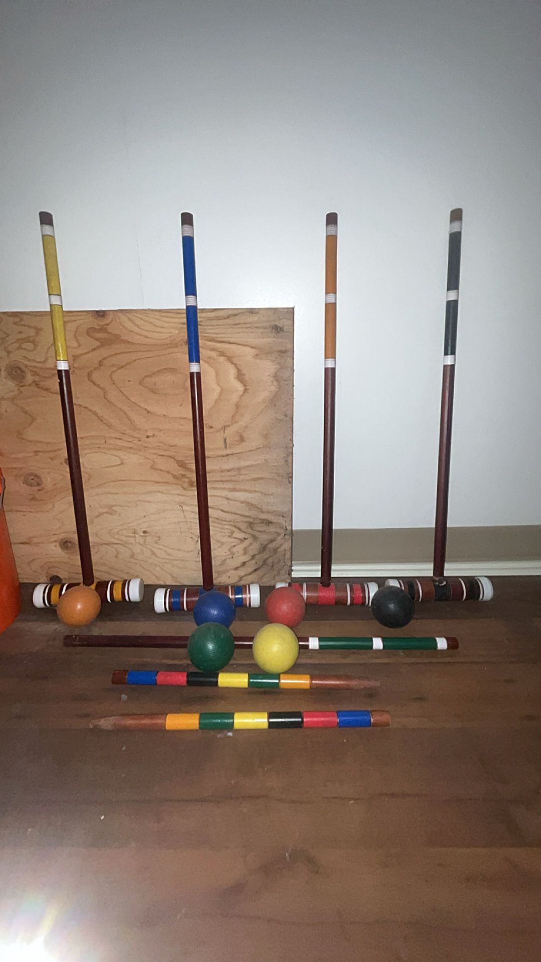 VINTAGE FORSTER CROQUET Set - originally a 6 Player set, however, over the years one of the mallets was misplaced and another lost the top hammer so down to a 4 player set. The 4 remaining mallets are still in great shape! Still have the arm for one of the mallets just not the hammer (as seen in pic). 6 all weather molded balls included and 2 wooden stakes - all still in good condition! Will need to purchase new wickets but those are super cheap to replace (less than $10 on Amazon)