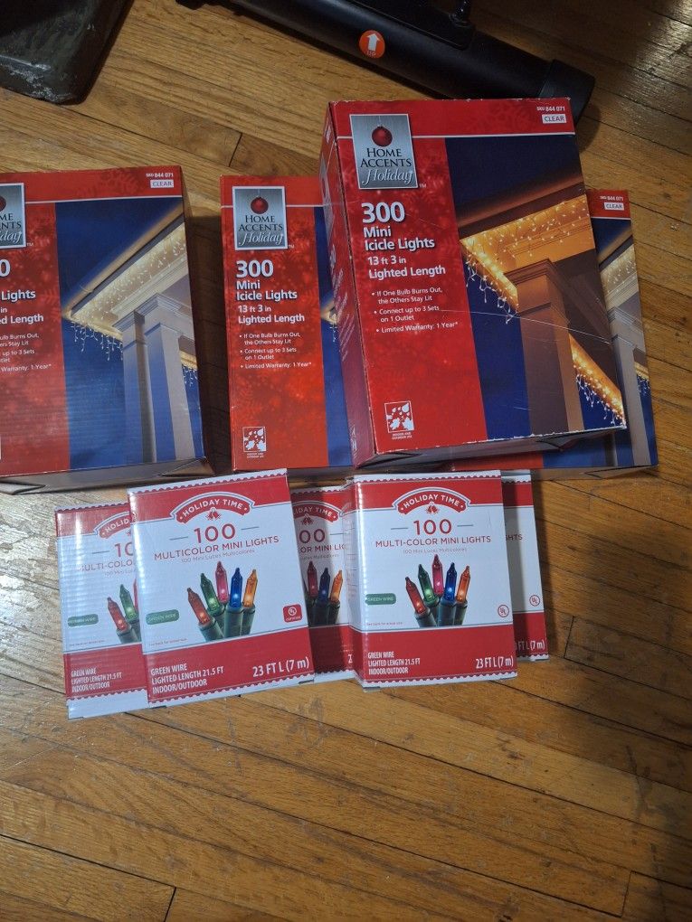 4 packs of 300 mini icicle lights 5 packs 100 multi color lights 8 red and green bows 5 red and white bows