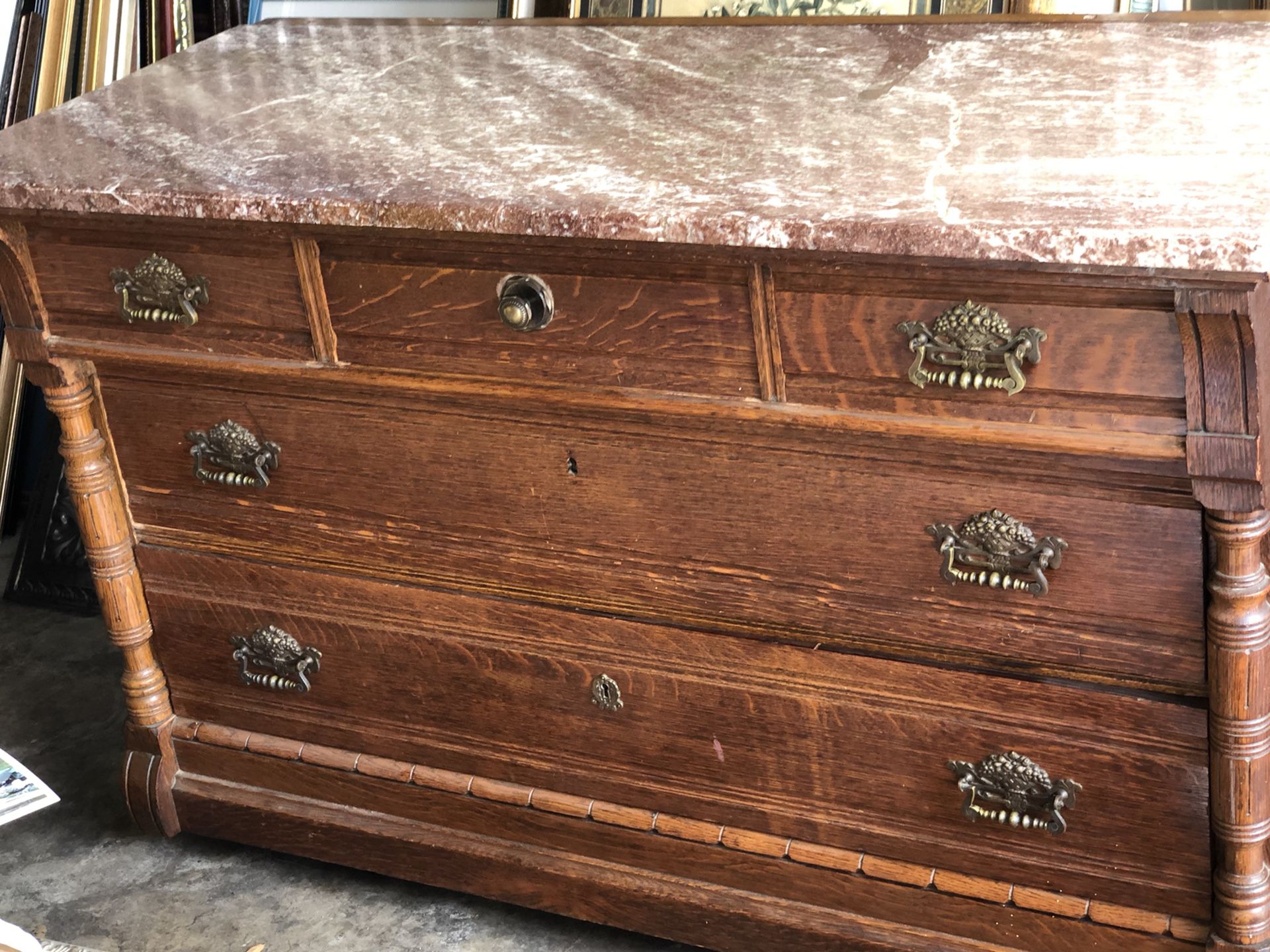 Antique Tiger Wood Oak dresser with marble top 50” w x 31.5” h x 21.75” d Beautiful Handles Great Condition From smoke free and pet free environment Location Longwood Florida