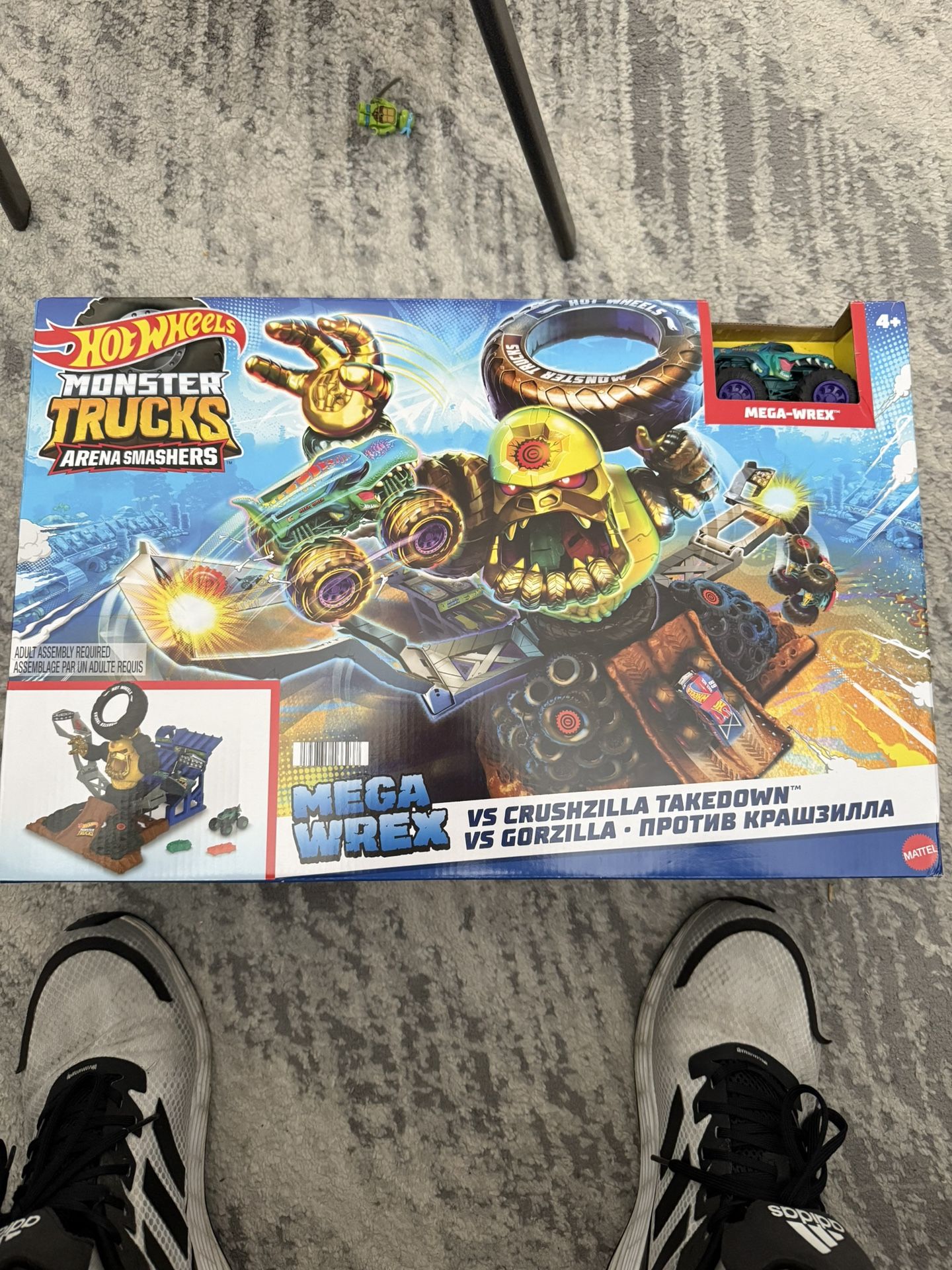 Get ready for heart-pounding action with the Hot Wheels Monster Trucks Arena Smashers Mega-Wrex Versus Crushzilla Takedown playset. Ideal for kids aged 4 and up, this dynamic set delivers an immersive experience of crashing and smashing excitement. In this thrilling showdown, kids take control of Mega-Wrex, launching it at the spinning and pivoting Crushzilla to claim victory in the challenge. The toy car playset's base adds an extra layer of intensity, moving, and shaking during play to provide sensory feedback that enhances the crashing and smashing sensation. What sets this play figure playset apart is the interactive nature of Crushzilla's movements. Responding dynamically to Mega-Wrex's attacks, Crushzilla covers a 360-degree play area, unveiling incredible details for kids to explore. The set includes one Hot Wheels Monster Trucks Mega-Wrex in 1:64 scale and two crushable cars, adding strategic elements to the grandstands or creating thrilling scenarios for Crushzilla. For added replay value, kids can feed crushable and die-cast cars into Crushzilla's mouth, then aim Mega-Wrex strategically to free them. Connect the Mega-Wrex vs. Crushzilla Takedown to other Hot Wheels Monster Trucks Arena Smashers sets, creating a Monster Trucks arena packed with diverse challenges and obstacles (additional sets sold separately).