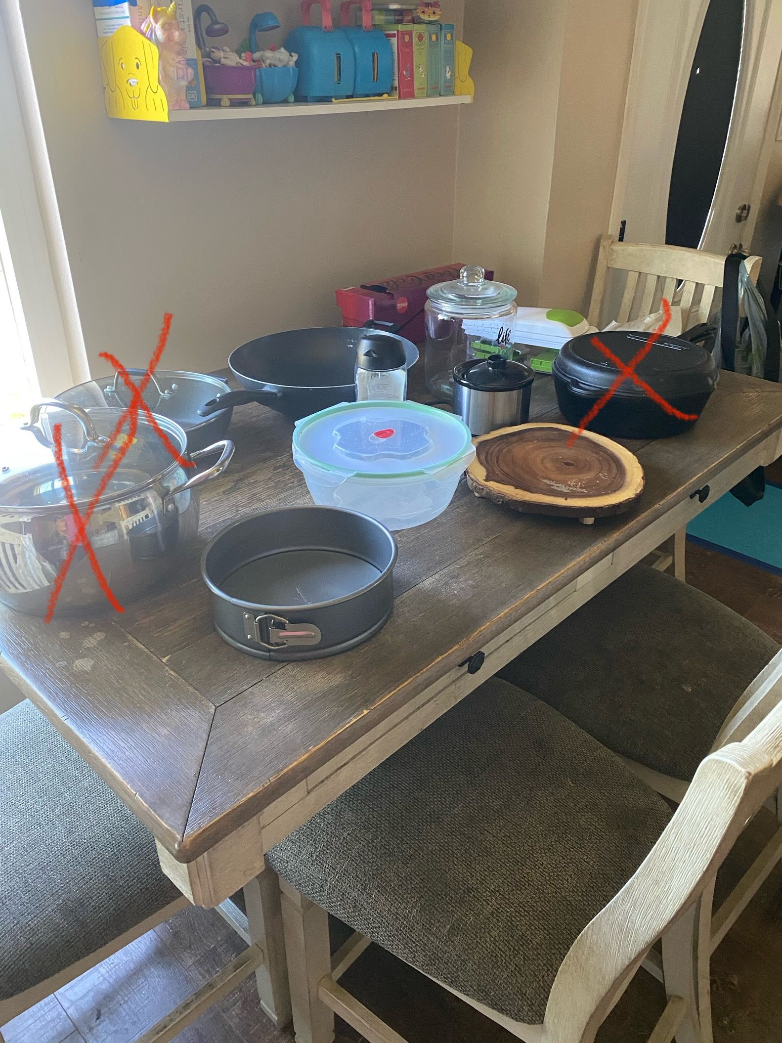Kitchen item. $5 mini crockpot $5 cookie jar $5 Tupperware with snap on lid $5 cheesecake pan $10 veggie chopper $10 large wok (no lid)