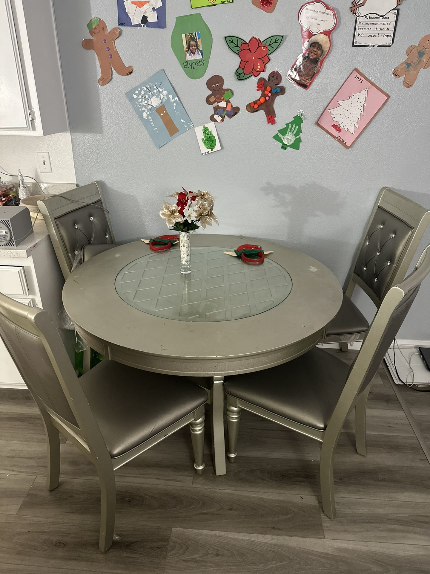 Round dining table. Glass top in the middle. Diamond studded chairs.One chair needs cushion re attached I don’t have the screws for it but u can get some at a hardware store. Table has 2 discoloration spot. Other than that beautiful sturdy table. Just to big for my apartment.