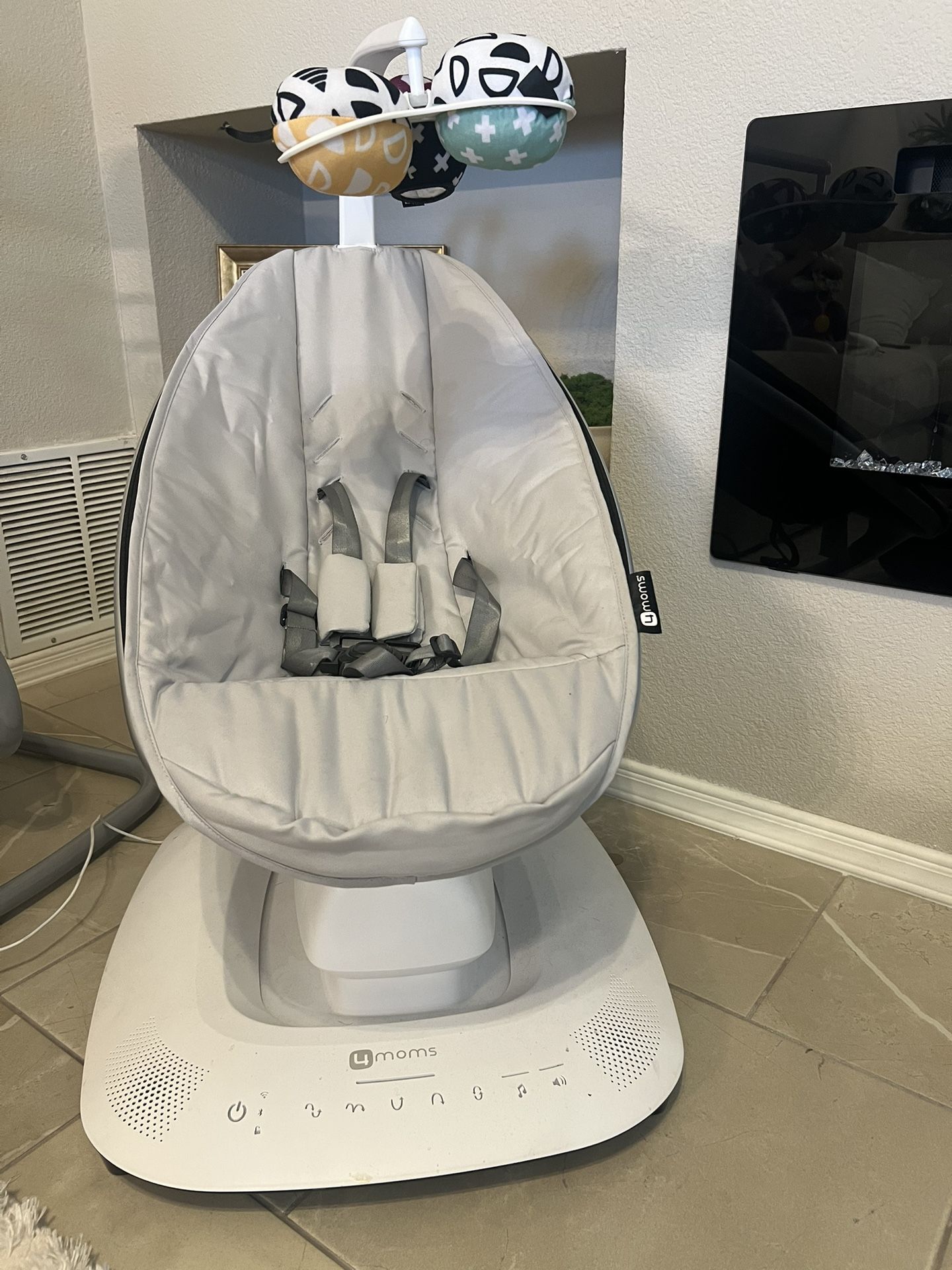 “The 4moms mamaRoo is a smart baby swing that mimics natural parenting motions (car ride, kangaroo, tree swing, rock-a-bye, wave) with 5 speeds, 4 built-in sounds, and app/voice control for soothing babies, offering hands-free comfort with adjustable recline, washable seat, and interactive toys, used from birth up to 25 lbs, with smart features and a design focused on complementing modern homes. “