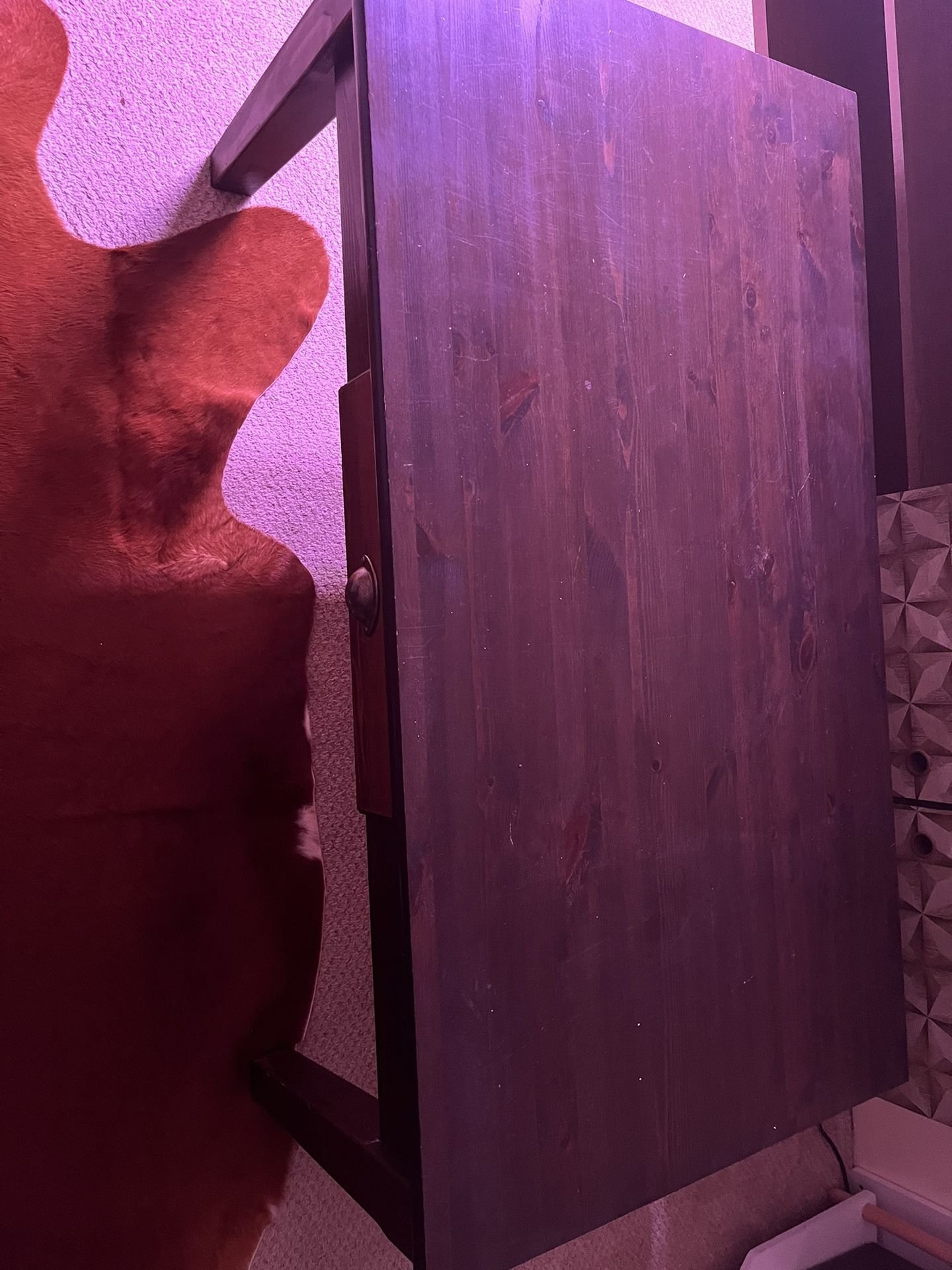4ft x 2 ft table 18 inch tall. With drawer. Beautiful dark wood look. Clean