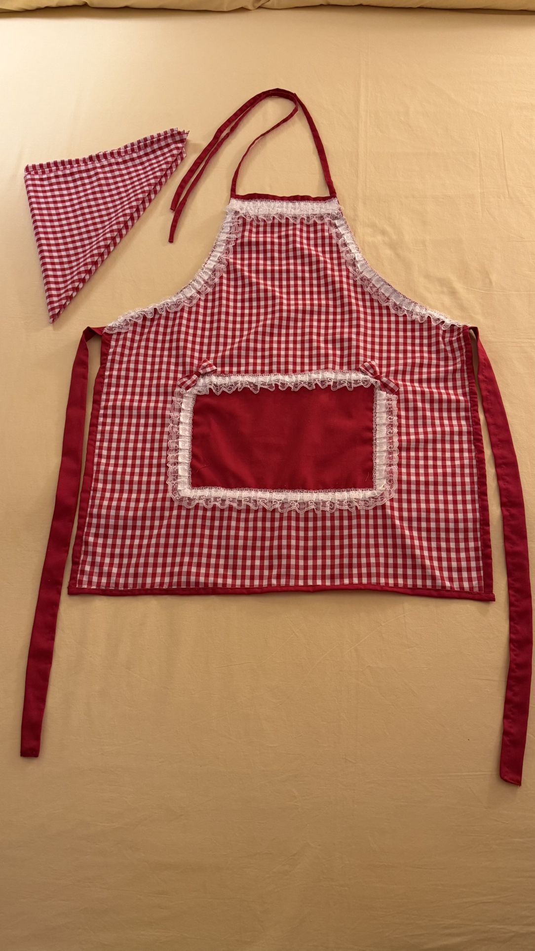 This is at home handmade apron with 100% cotton! Made with much love! Red and white checkered design colors, it is 28 inches long and 23.5 inches wide, around a small and medium size! Includes a matching head wrap as well! Perfect to add some fun flair to your cooking! Will accept in person cash payment.