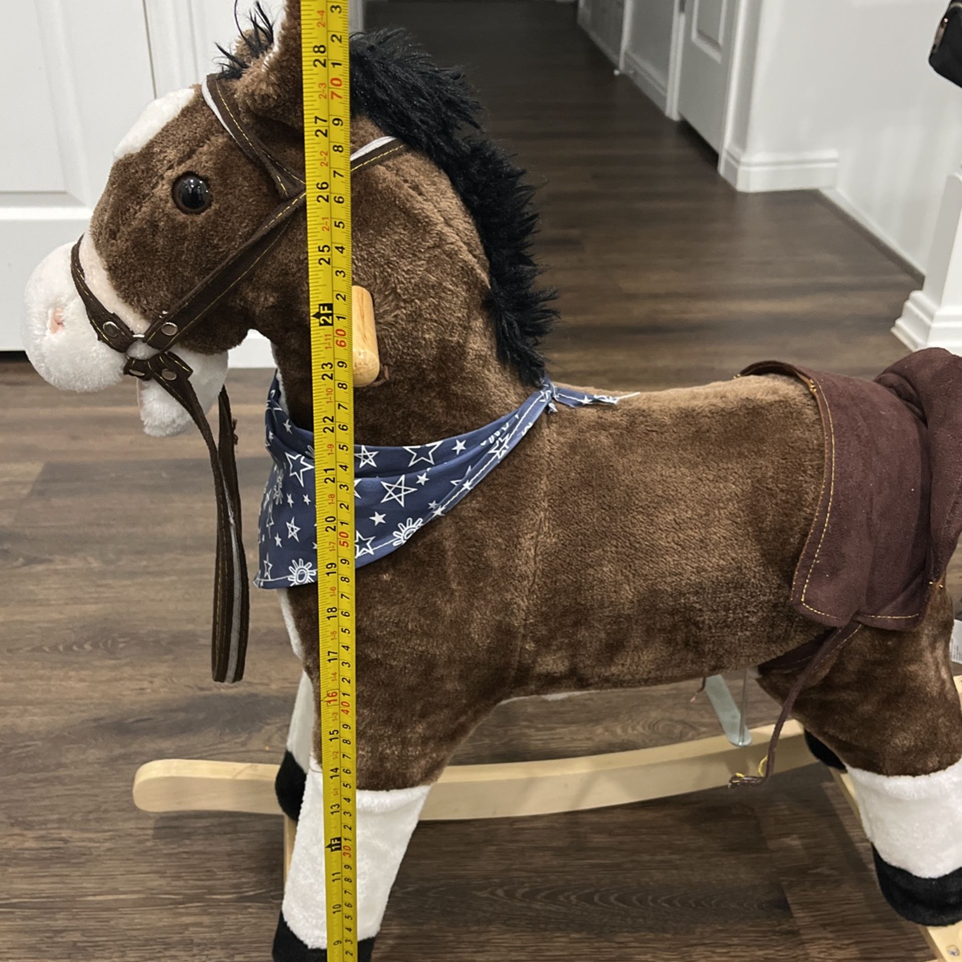 My daughter used a few times. Age between 6 months to 8yrs old. Very solid horse. There is a button on the ear to make some horse noises.